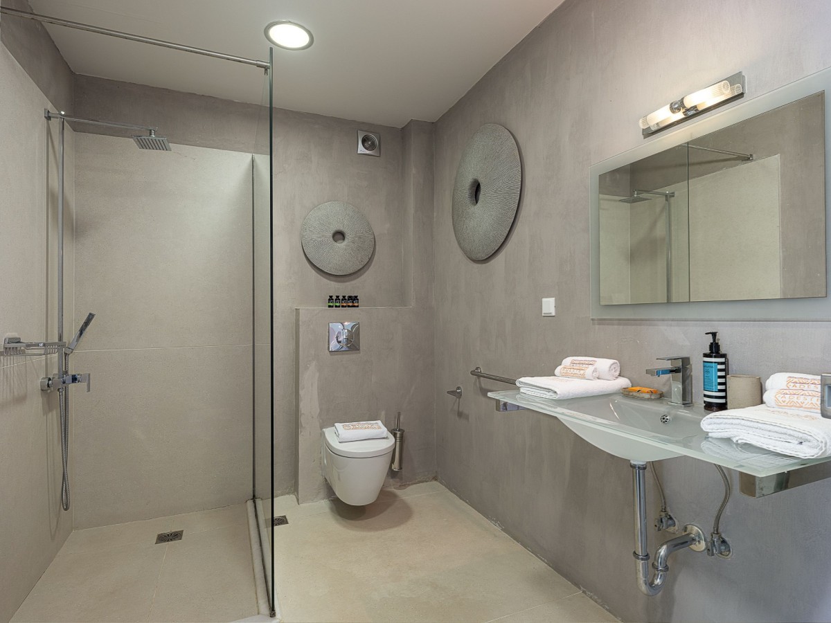 Bedroom 1: Ground floor bedroom with a queen-size bed,  A/C, WiFi, TV, and en-suite bathroom with hydromassage shower, vanity, and WC. 2 guests maximum