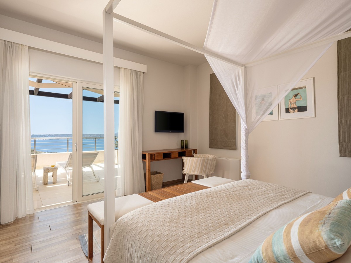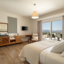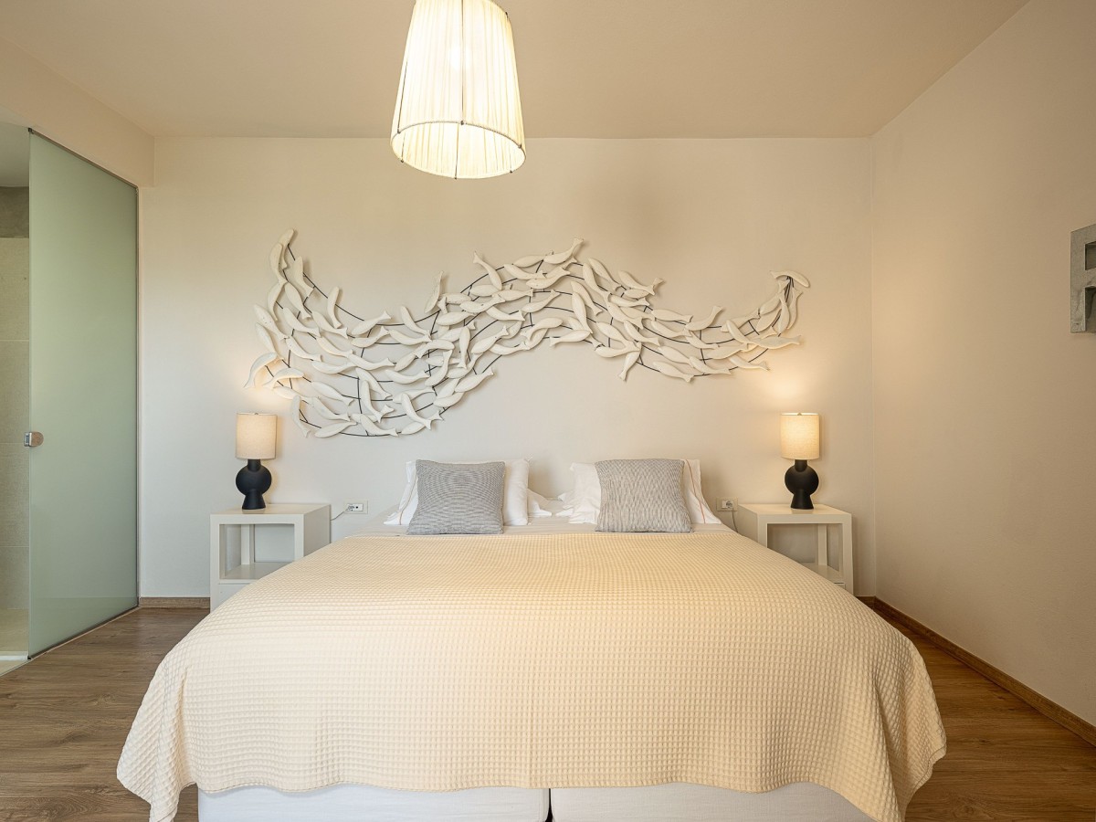 Bedroom 2: First floor bedroom with a king-size bed,  A/C, WiFi, TV, terrace, panoramic view, and en-suite bathroom with bathtub, vanity, and WC. 2 guests maximum