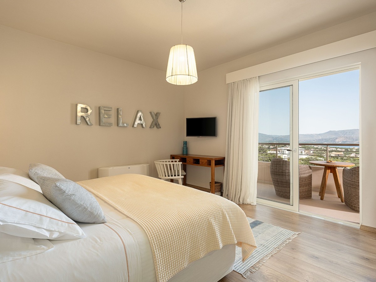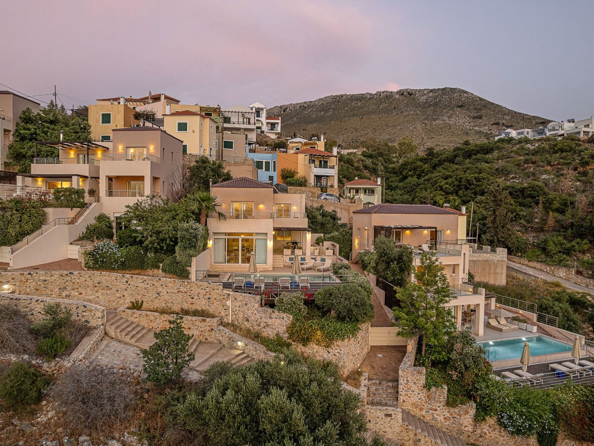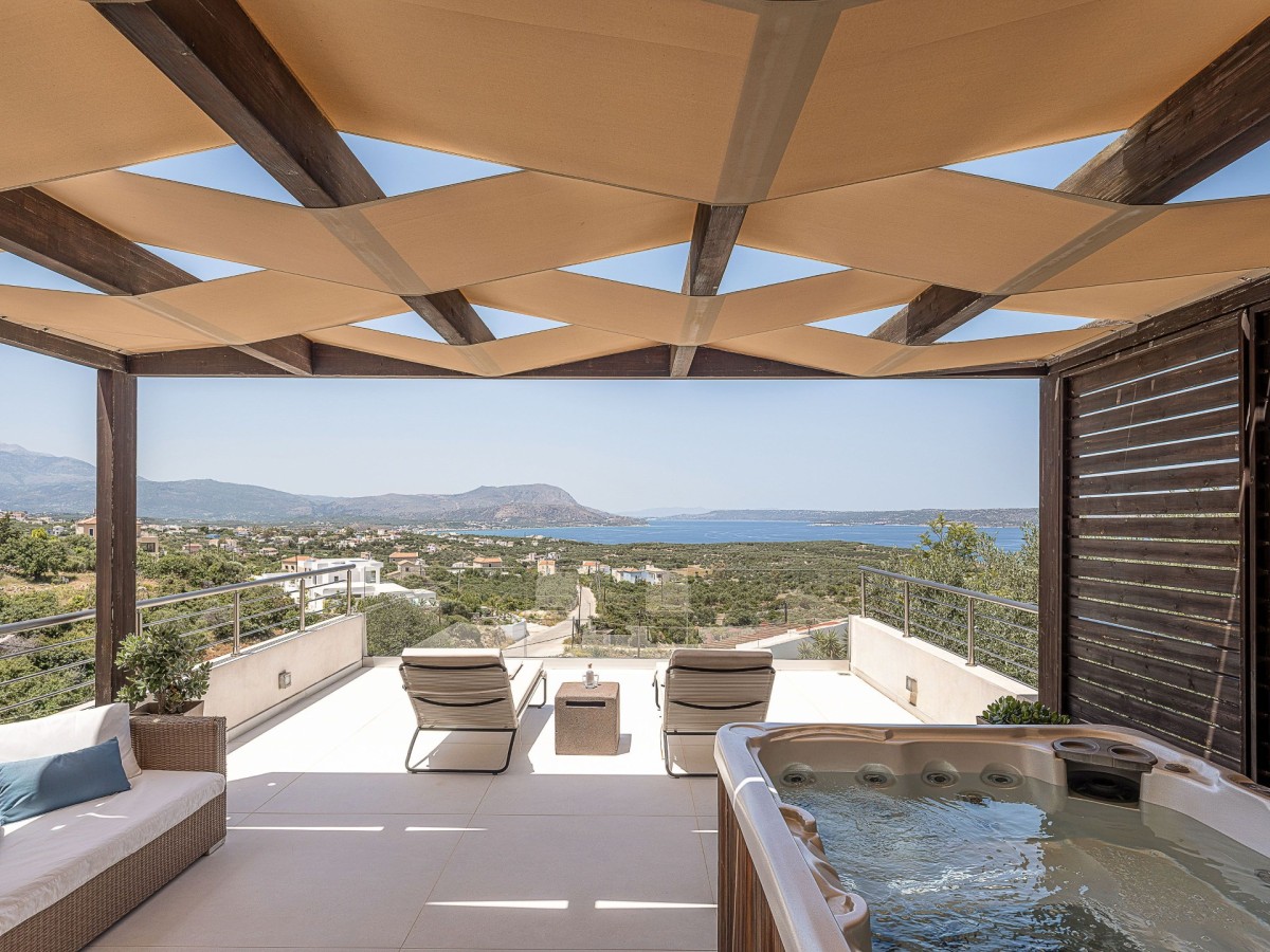 Villa Aori is a serene sanctuary with a private pool, hot tub, and sweeping sea views, located on the lowest level of the Adeste Villas Complex — yet offering no compromise when it comes to scenery. From its secluded position, the villa overlooks the brilliant blue waters of Souda Bay, the charming villages of Apokoronas, and the majestic White Mountains, making it the most private and peaceful retreat in the complex.