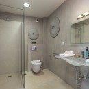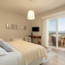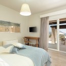 Bedroom 3: First floor bedroom with two single beds (can be made up as a king-size bed),  A/C, WiFi, TV, private balcony with sea view, and en-suite bathroom with hydromassage shower, vanity, and WC. 2 guests maximum