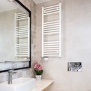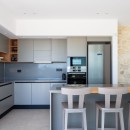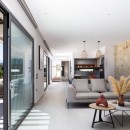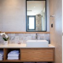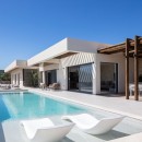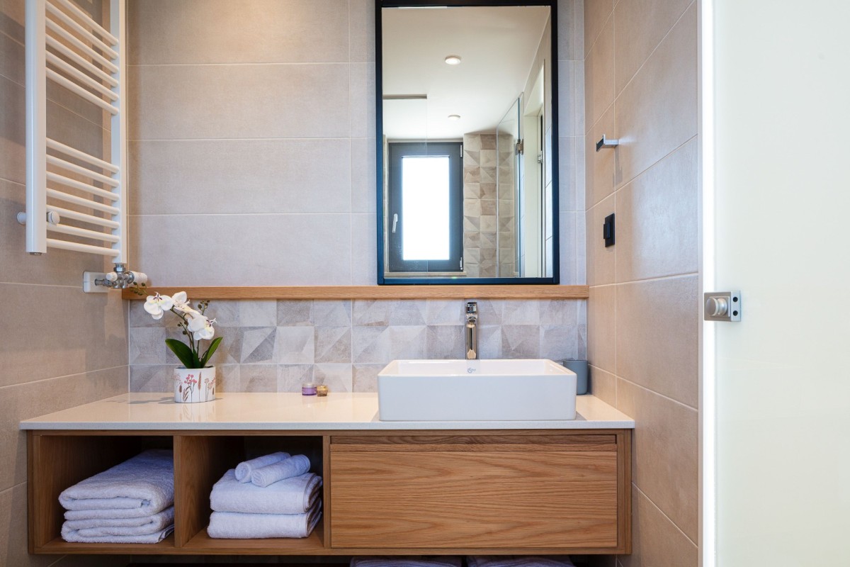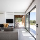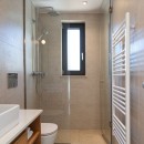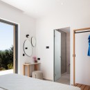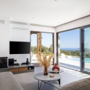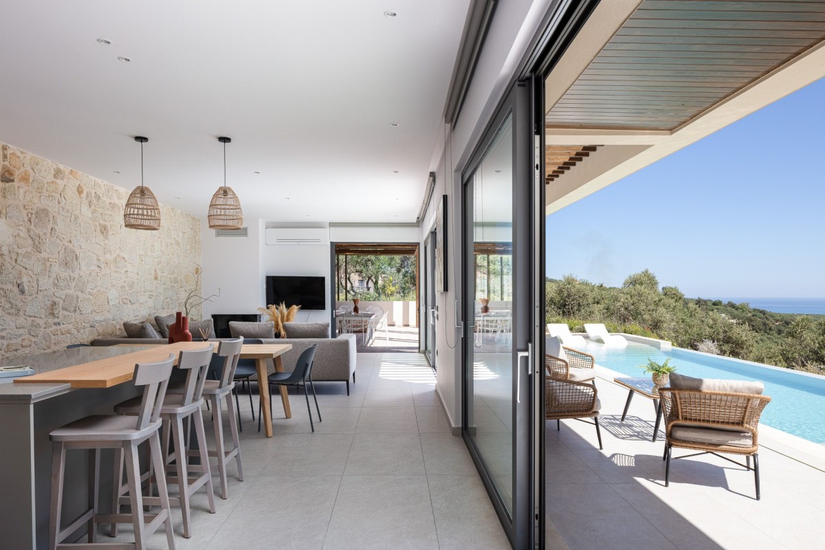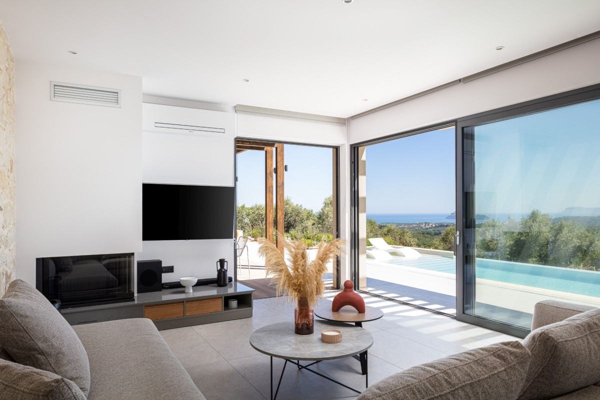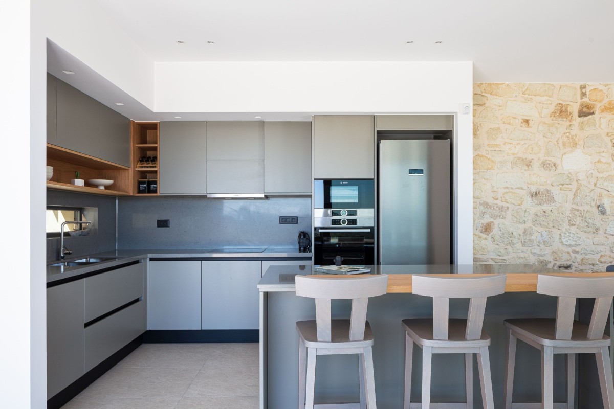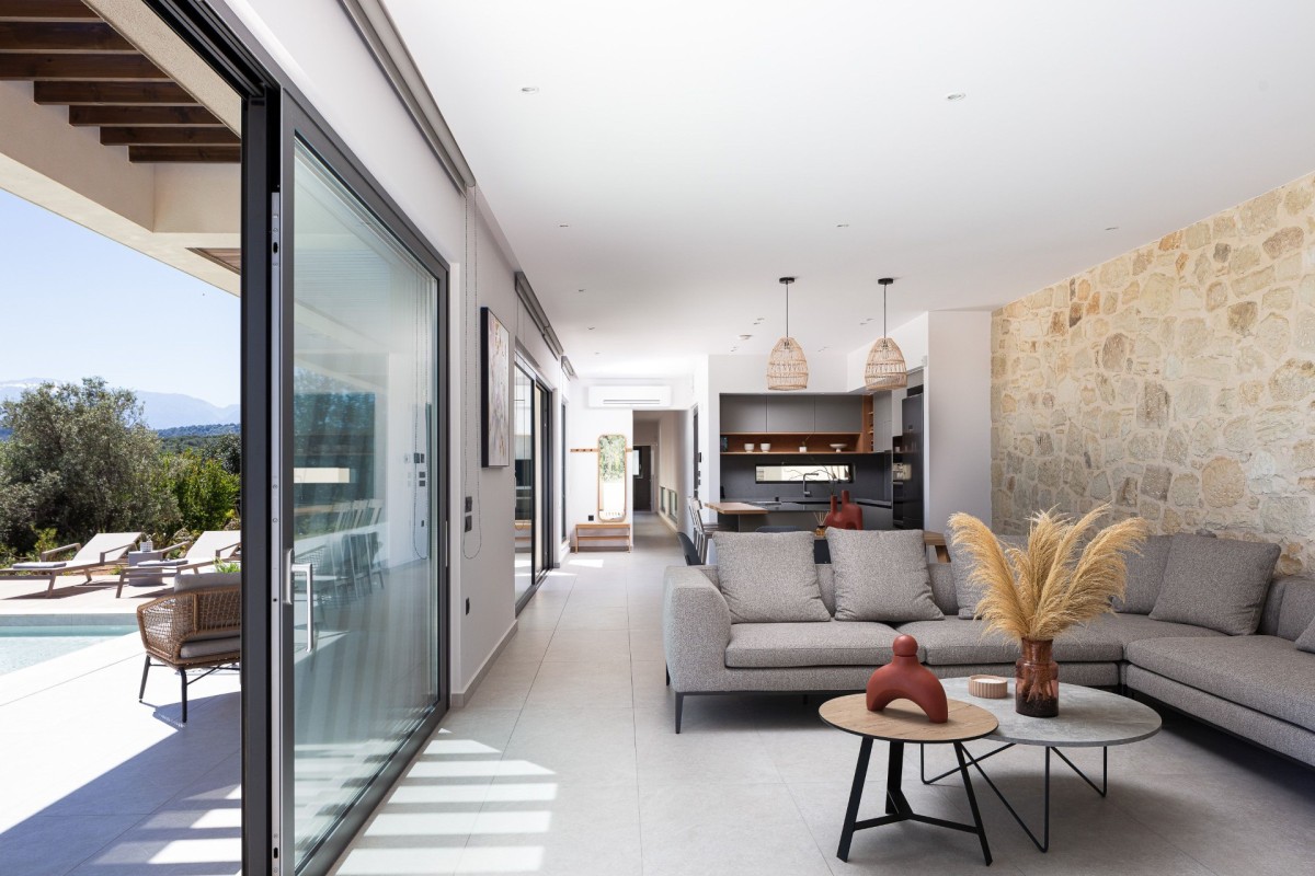 Covering 157 sqm, the villa accommodates up to 6 guests in three beautifully appointed ensuite bedrooms. Earthy stone and wood elements combine with soft, neutral tones to create a calming, contemporary interior. The open-plan living area is bright and airy, with large windows letting in natural light and offering a seamless connection to the outdoors. A generous lounge space wraps around the fireplace and a 55” Smart Satellite TV, while the fully equipped kitchen and dining area provide everything needed for shared meals and memories.