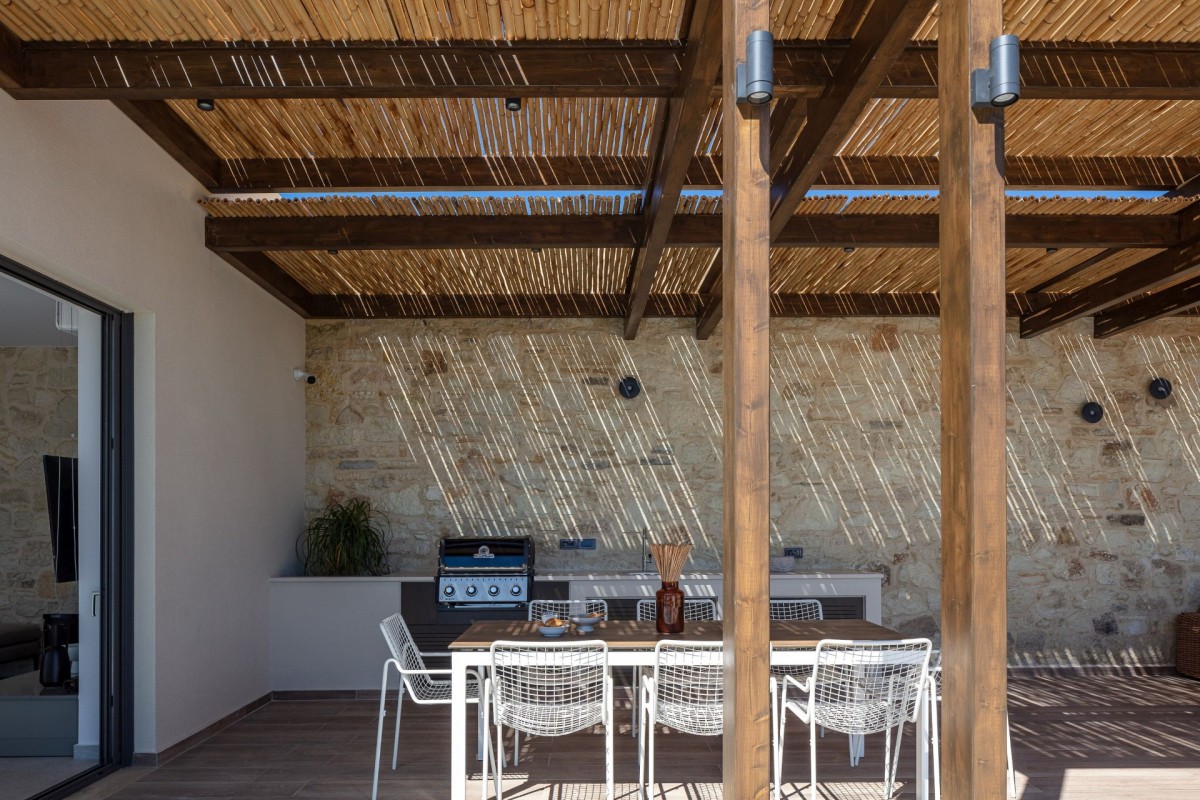 Step outside into your own private paradise: a 1,087 sqm plot with a 40 sqm saltwater pool, sun loungers, and a shaded lounge area. Whether you're swimming, sunbathing, or hosting a sunset BBQ under the pergola, Villa Aglaea offers a truly effortless outdoor lifestyle. The private terrace invites you to enjoy intimate dinners or relaxed evenings with breathtaking views over Xirokambi.