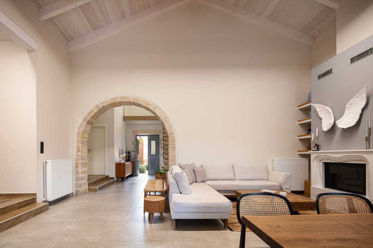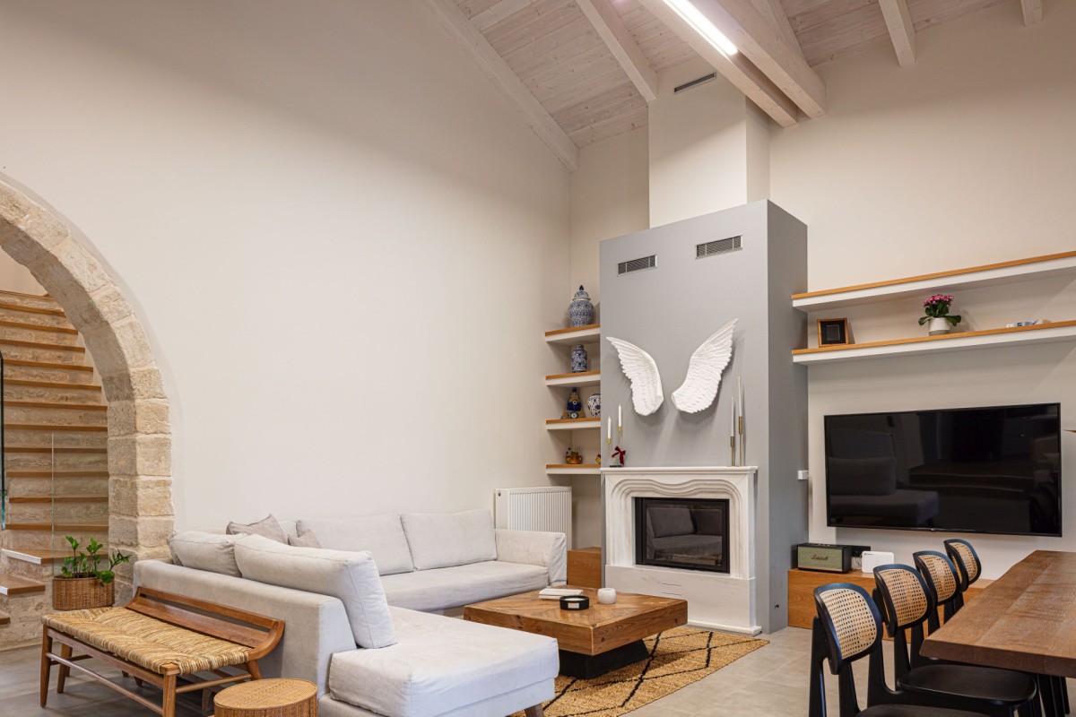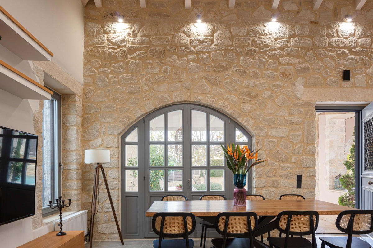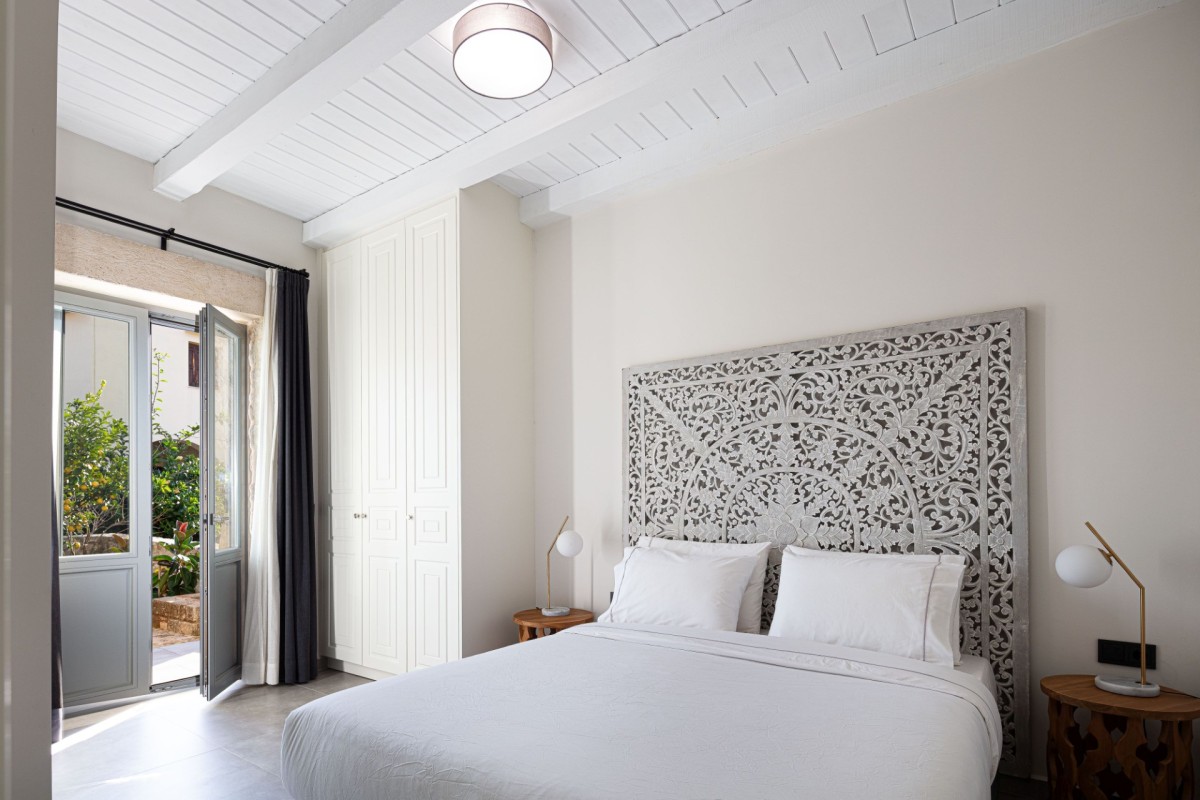 Upstairs, two elegant bedrooms offer restful spaces—one with twin beds and a private balcony, and another with a queen-size bed, an ensuite bathroom, and a balcony overlooking the Cretan mountains.