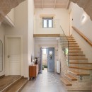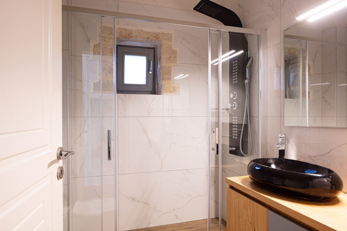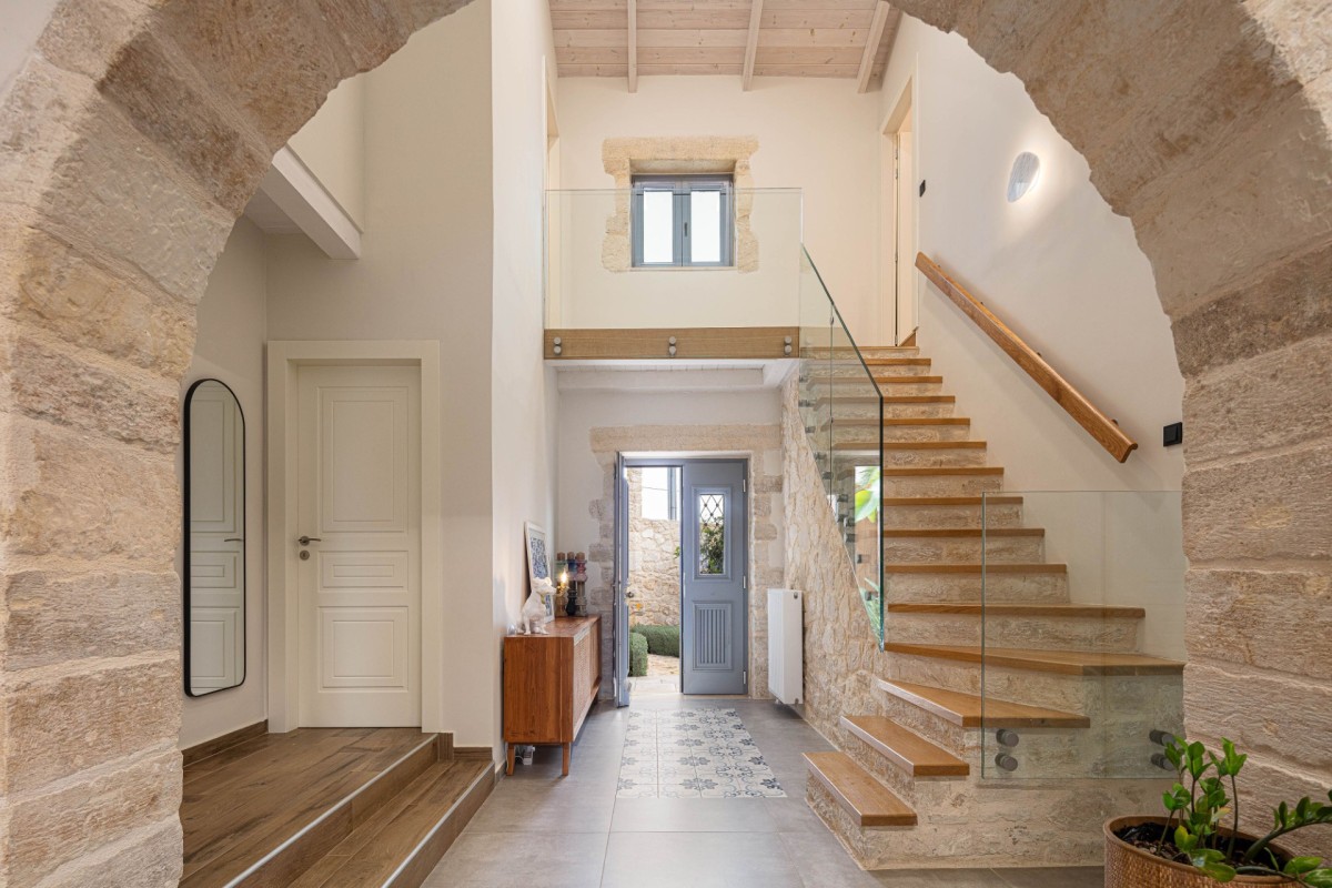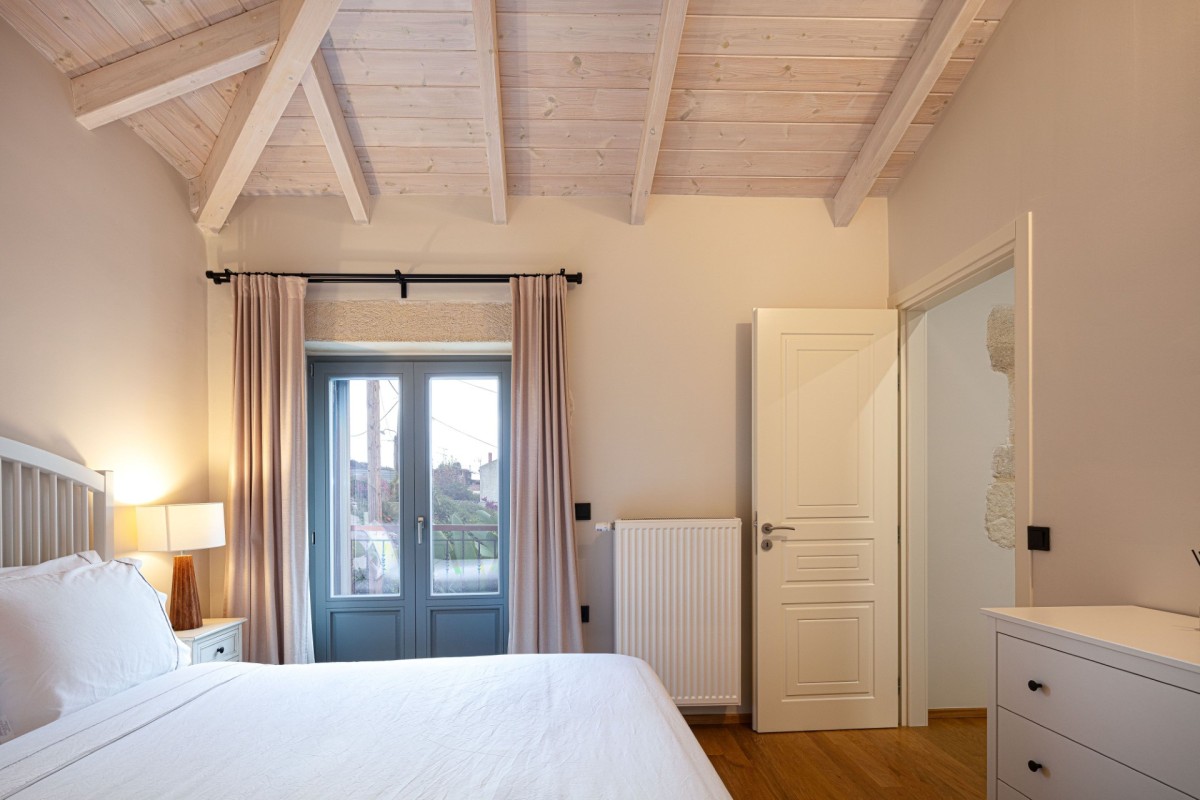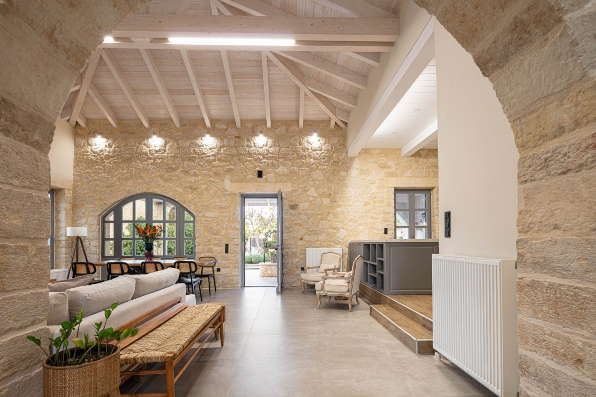 Upstairs, two elegant bedrooms offer restful spaces—one with twin beds and a private balcony, and another with a queen-size bed, an ensuite bathroom, and a balcony overlooking the Cretan mountains.
