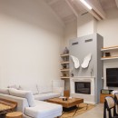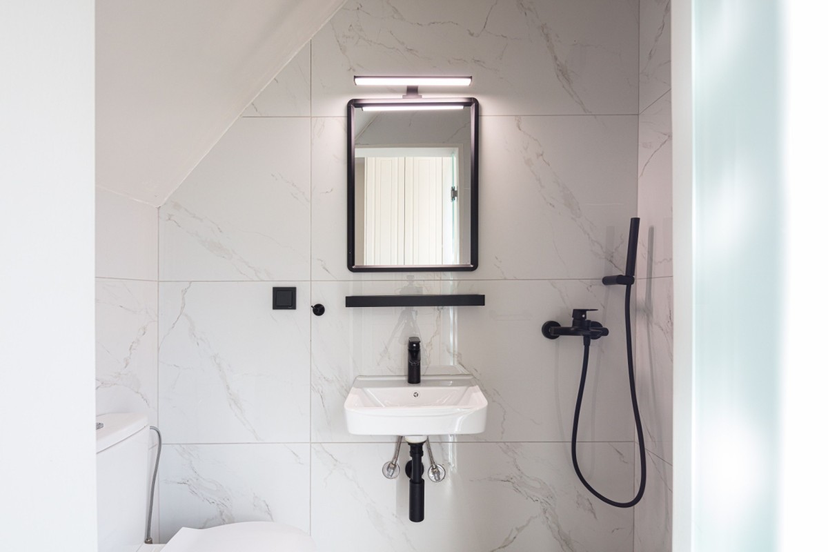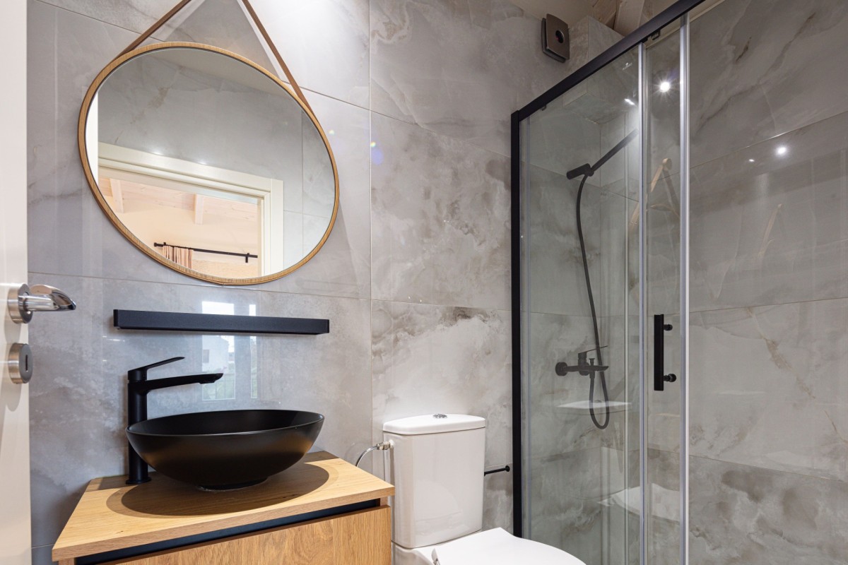 The villa spans two stylish levels with a warm, welcoming interior. On the ground floor, a spacious open-plan living area features a comfortable sofa, a 65” Smart TV, and a decorative fireplace, opening onto a sunny terrace. The fully equipped kitchen and dining area for eight are perfect for sharing meals made with fresh local ingredients. This level also includes a bedroom with a king-size bed and an ensuite bathroom, plus an additional shower bathroom for convenience.