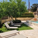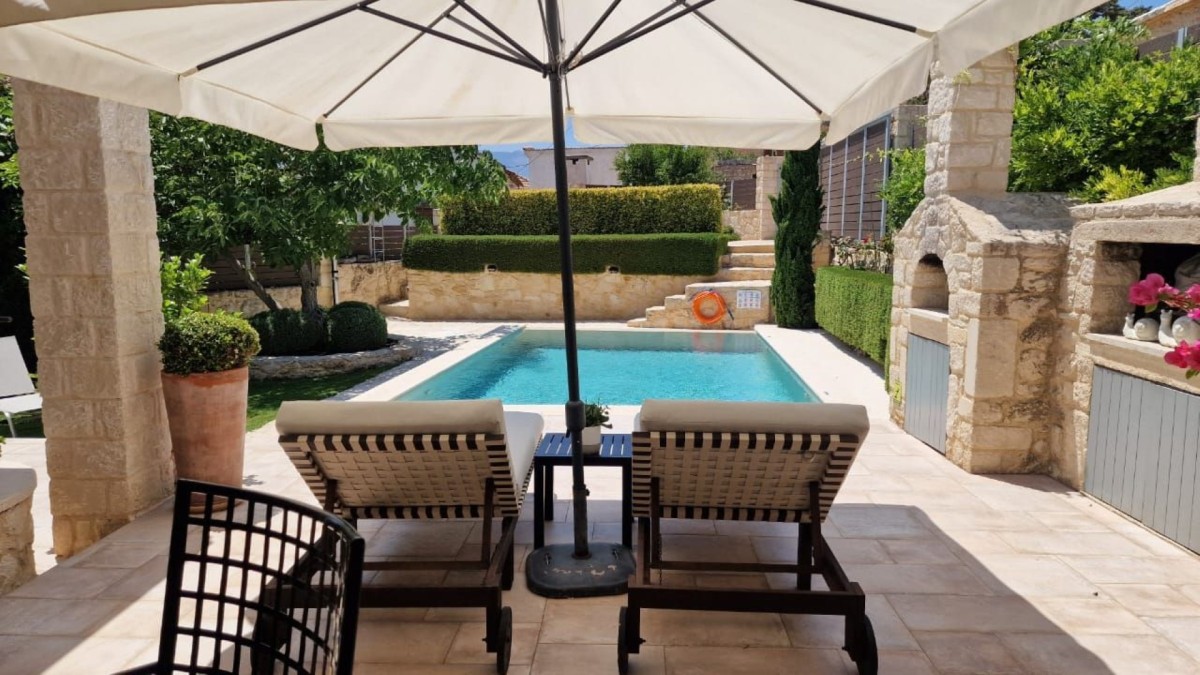 Outdoors, the villa features a private 20 sqm pool, sun loungers, umbrellas, and a beautifully landscaped garden. Two shaded dining areas, a charcoal barbecue, and an outdoor shower make it ideal for al fresco meals and relaxing under the Mediterranean sun. Private parking for two cars is also available.