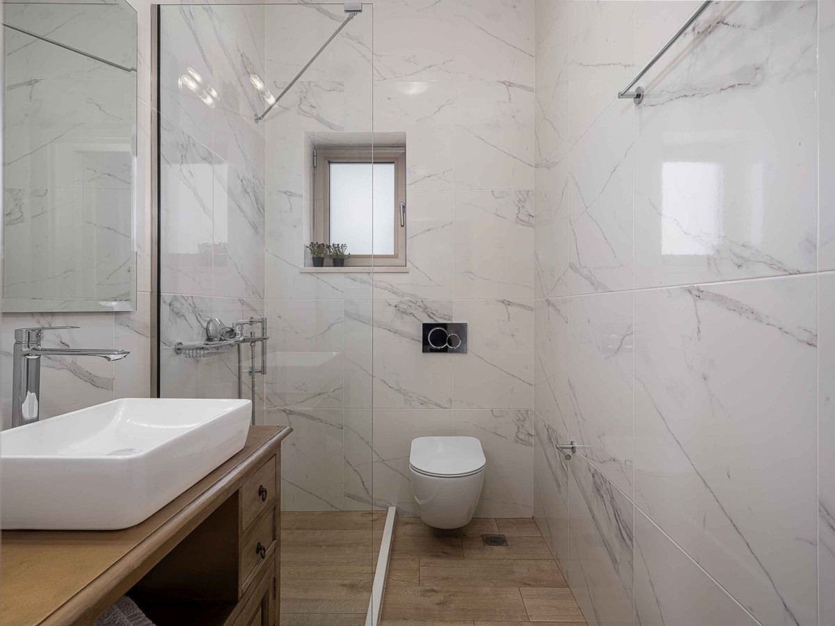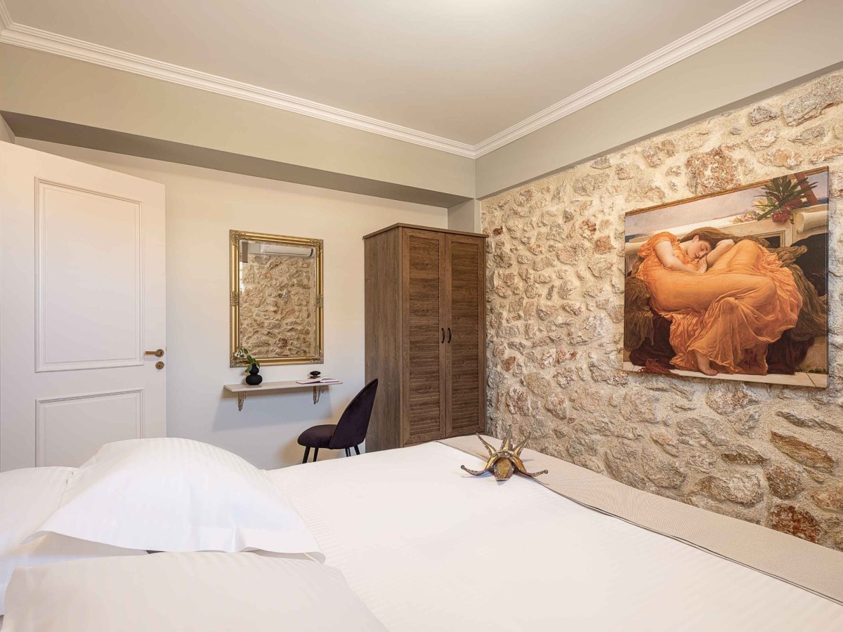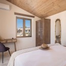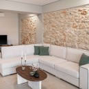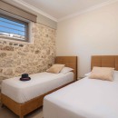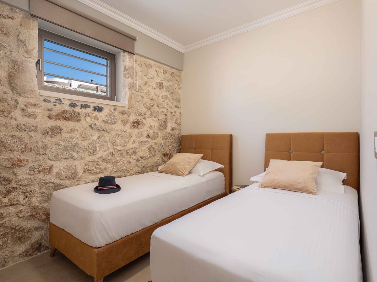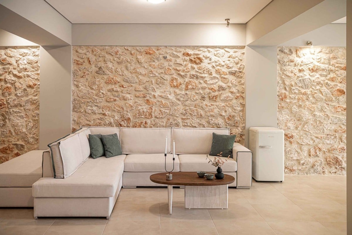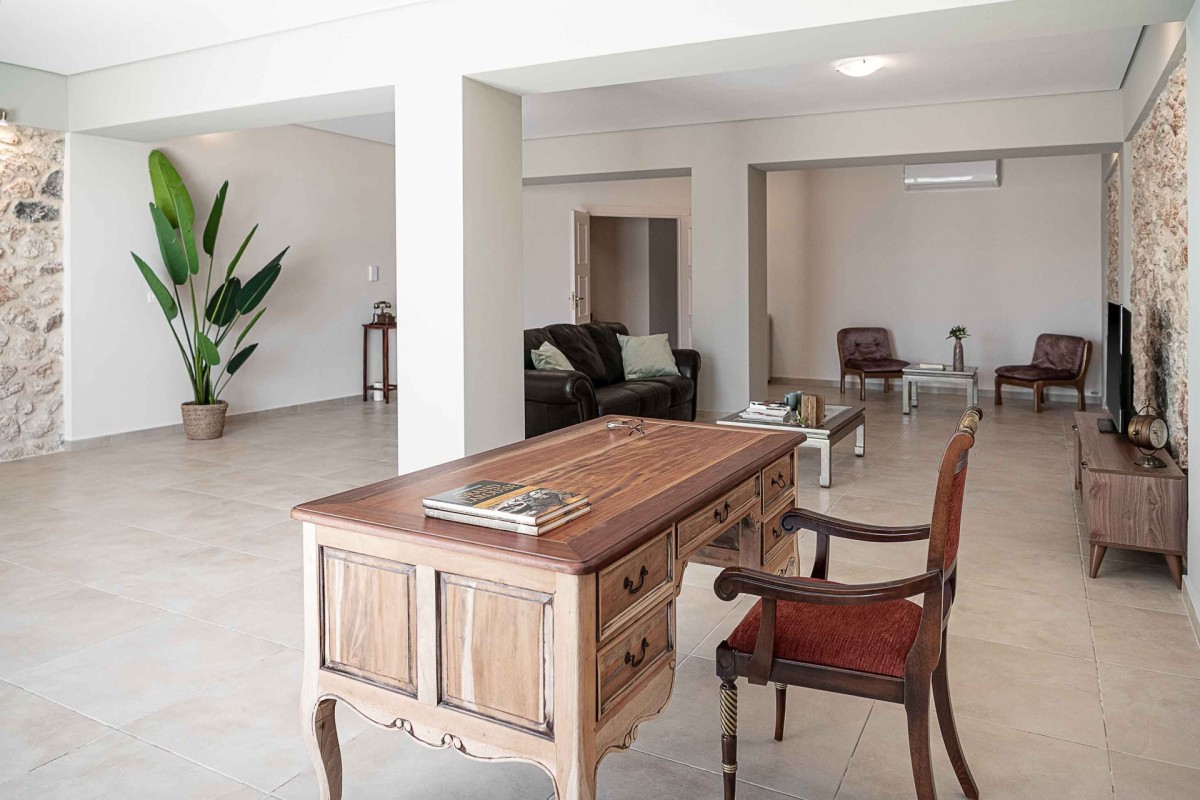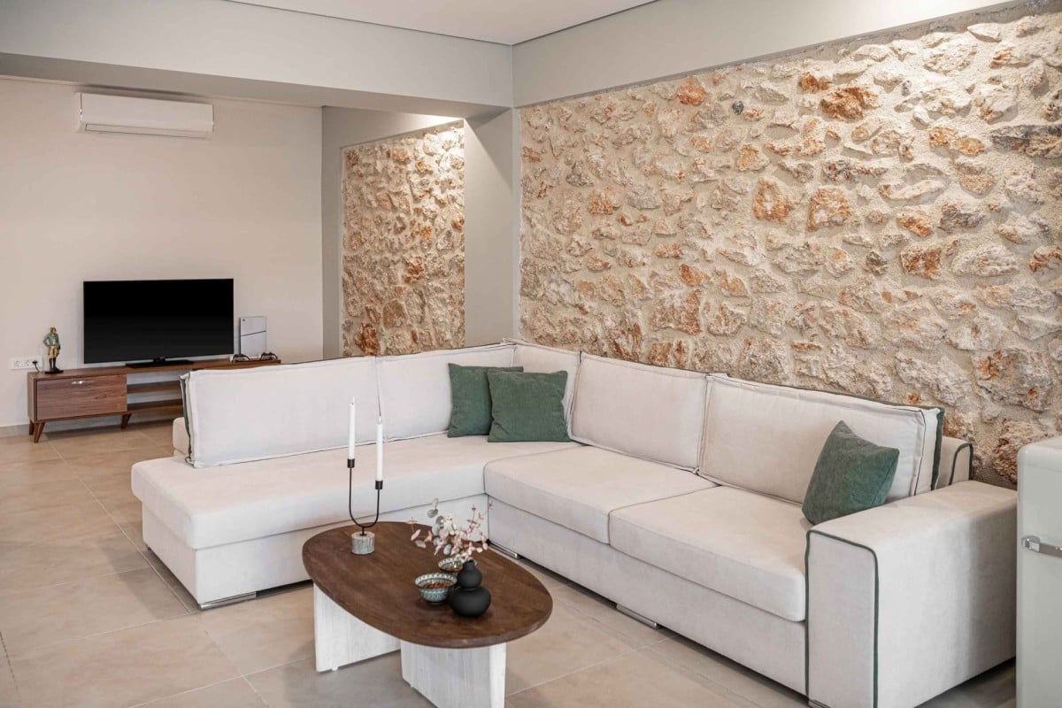 Inside, the 234 sqm villa is thoughtfully designed to combine style with functionality. The open-plan living room welcomes guests with large windows, a 55-inch Smart TV with satellite channels, and a cozy seating area perfect for relaxation. A dedicated workspace with a chair also makes the villa ideal for guests working remotely. The ground level includes three tastefully decorated bedrooms and a shared bathroom with a shower. Unique multicolored exposed stone walls lend a rustic yet refined touch to this floor.