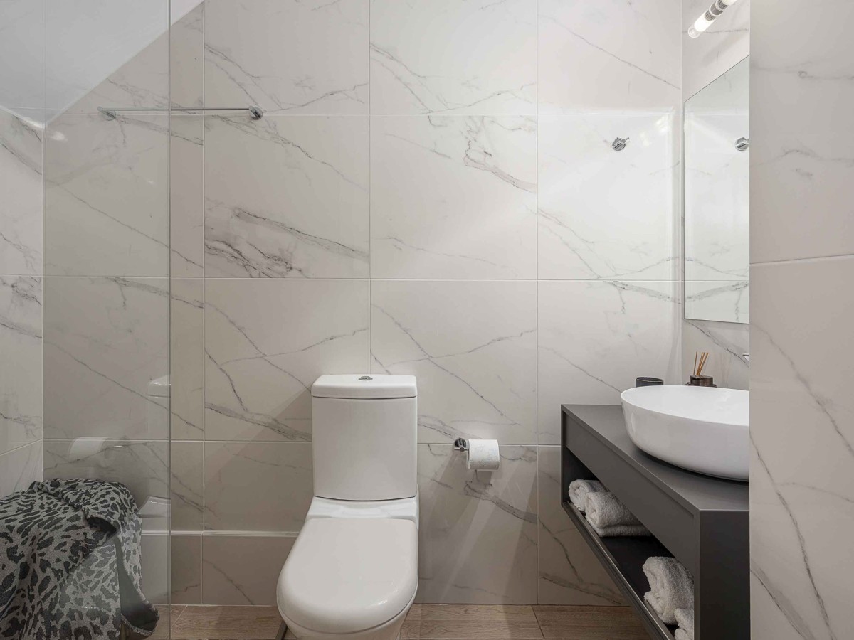 Bedroom 3: Ground floor bedroom with a queen-size bed,  A/C, WiFi, and shared bathroom with shower, vanity, and WC. 2 guests maximum