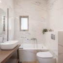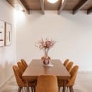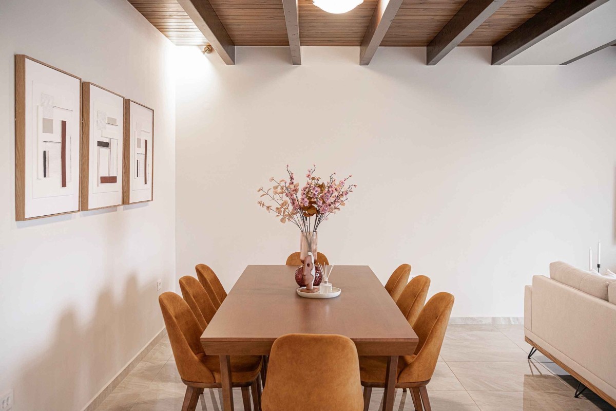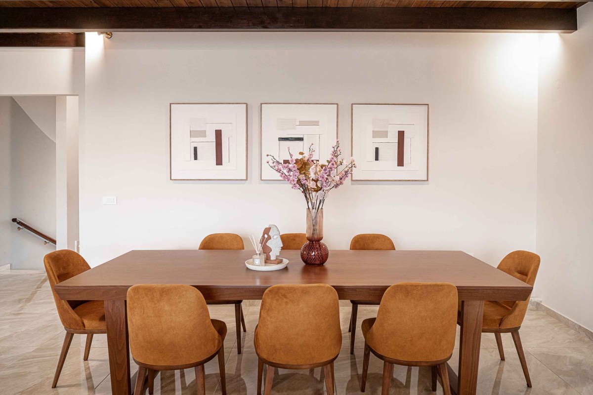 A polished marble staircase with a handcrafted wooden handrail connects all three levels. The first floor houses a fully equipped kitchen, complete with high-end appliances, custom cabinetry, and a spacious wooden dining table that seats all guests. This level also features a queen-size bedroom with balcony access and an additional shared bathroom.