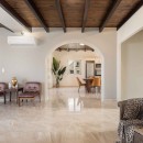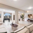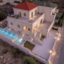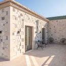 Built with light-toned, intricately carved stone, the villa's exterior exudes warmth and sophistication, featuring elegant curved archways and bronze-colored anodized aluminum windows that flood the interior with natural light and frame stunning views.