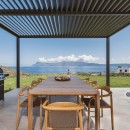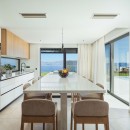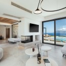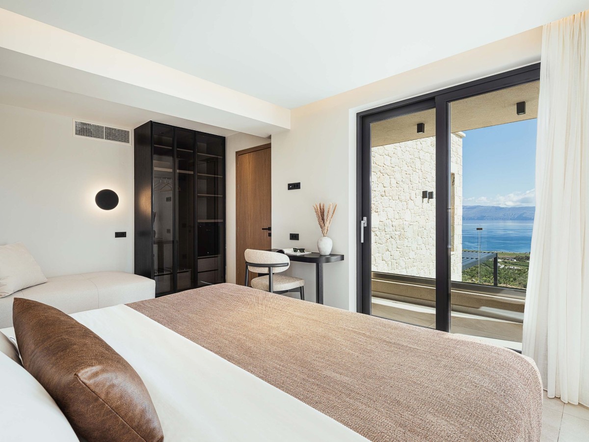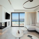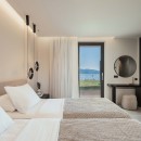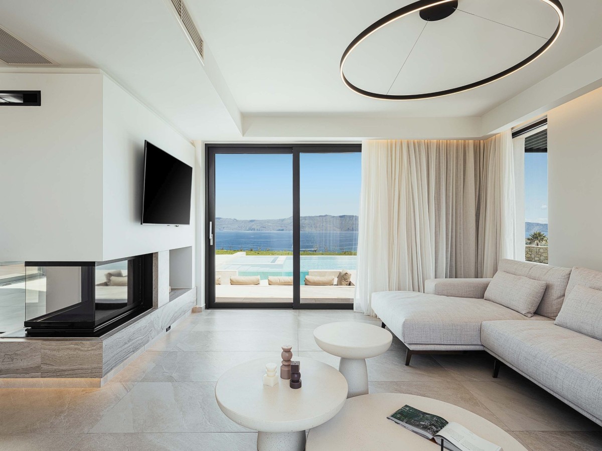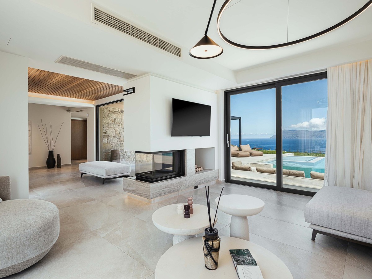 Inside, Rastoni Villa showcases a sleek, modern design with a focus on comfort and quality. The ground floor features an expansive open-plan space with a fully equipped contemporary kitchen, fitted with premium appliances for effortless holiday cooking. This area flows into a stylish dining space and a cozy living room with a 55" smart satellite TV and a fireplace. Floor-to-ceiling windows bring in abundant natural light and offer stunning sea views from nearly every angle, creating a seamless connection between the interior and the beautiful outdoor surroundings.