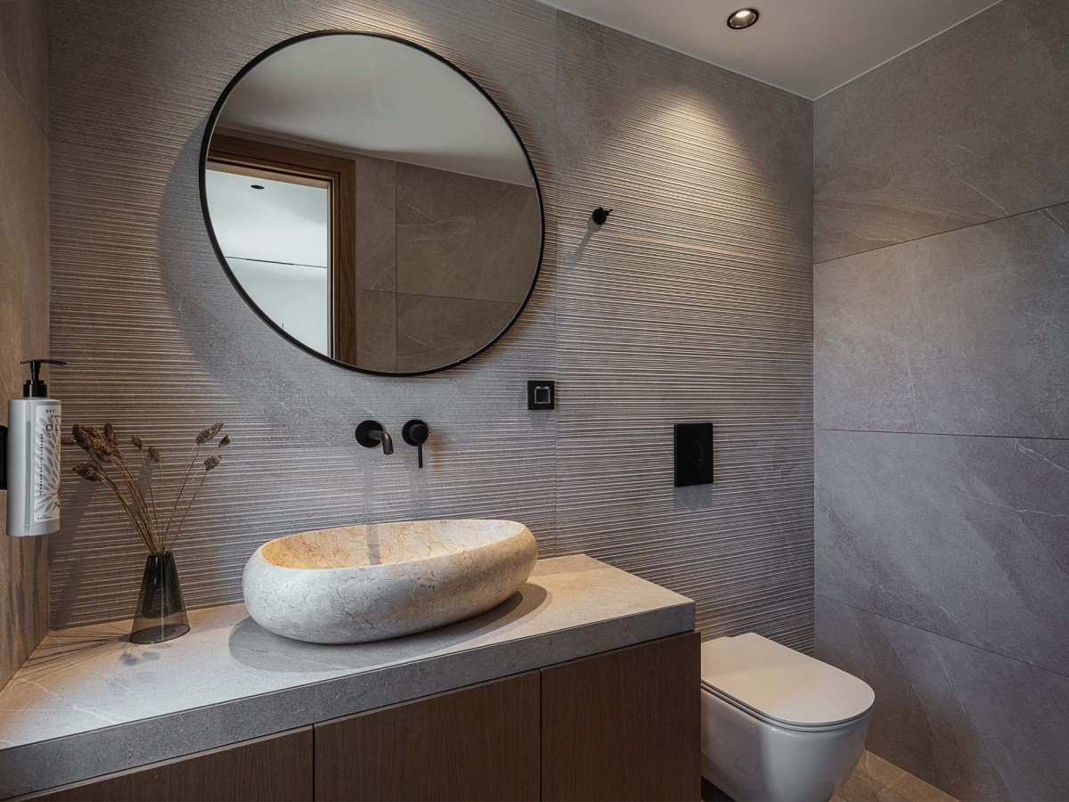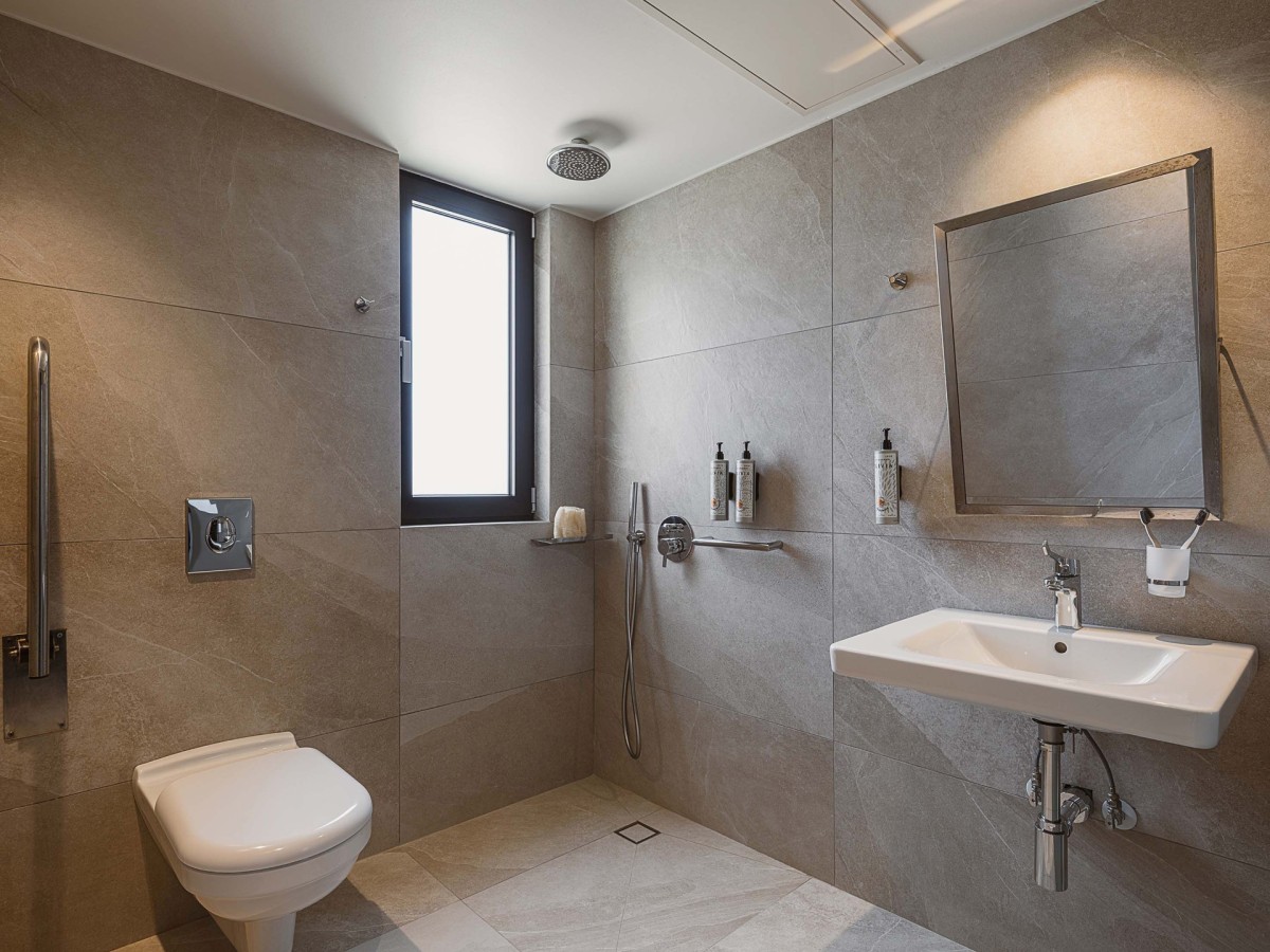 The villa features four bedrooms, each with an en-suite bathroom. Three of the bedrooms, each with a king-size bed, are located on the upper floor. The fourth bedroom is on the ground floor and features twin beds that can be converted into a king-size bed upon request. This room, along with its ensuite bathroom, is fully accessible for guests with mobility needs. An additional guest WC is also available on the ground level.