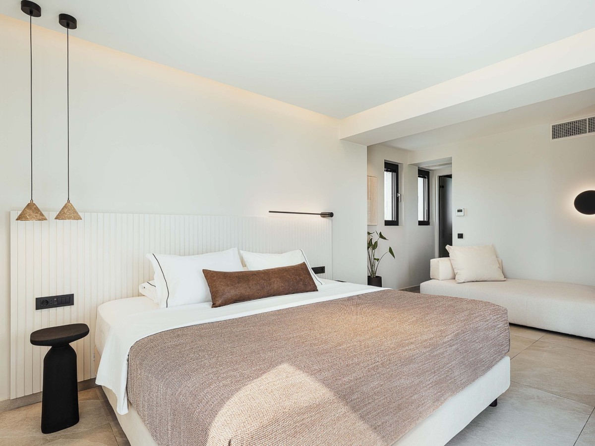 Bedroom 2: First floor bedroom with a king-size bed, A/C, WiFi, sofa, mini fridge, private balcony with sea view, and en-suite bathroom with shower, vanity, and WC. 2 guests maximum