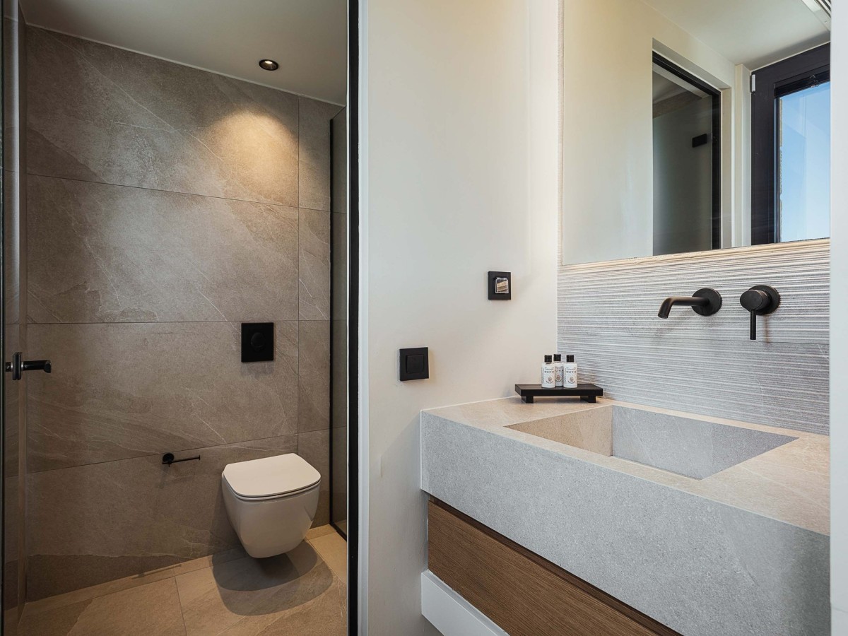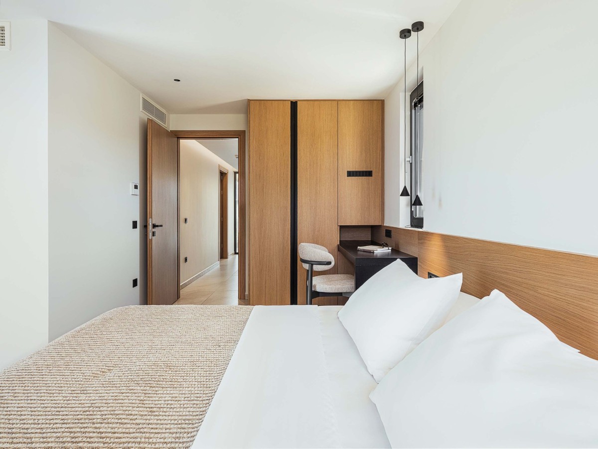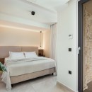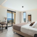 Bedroom 4: First floor bedroom with a king-size bed,  A/C, WiFi, mini fridge, private balcony with sea view, and en-suite bathroom with shower, vanity, and WC. 2 guests maximum