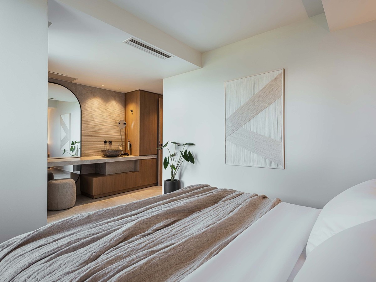 Bedroom 3: First floor bedroom with a king-size bed,  A/C, WiFi, mini fridge, private balcony with sea view, and en-suite bathroom with shower, vanity, and WC. 2 guests maximum