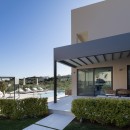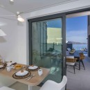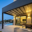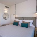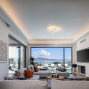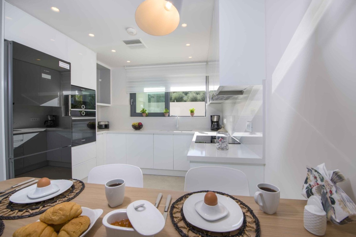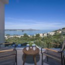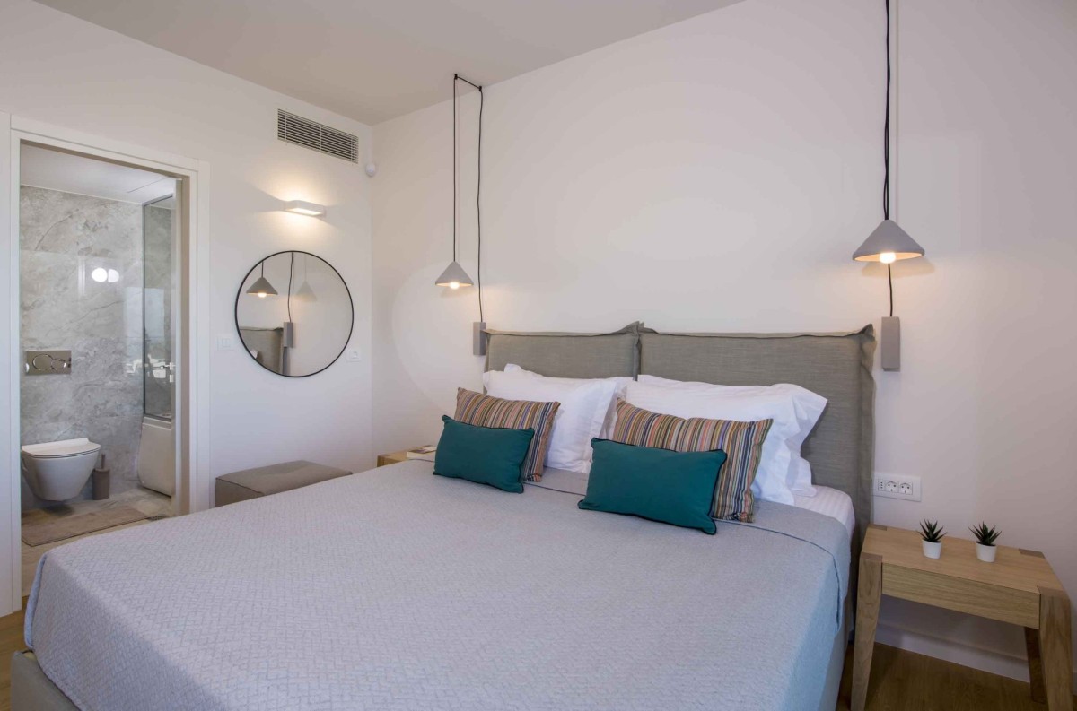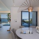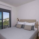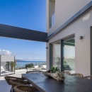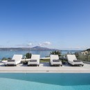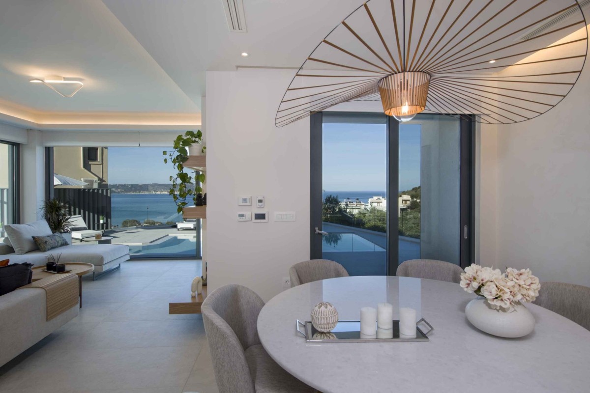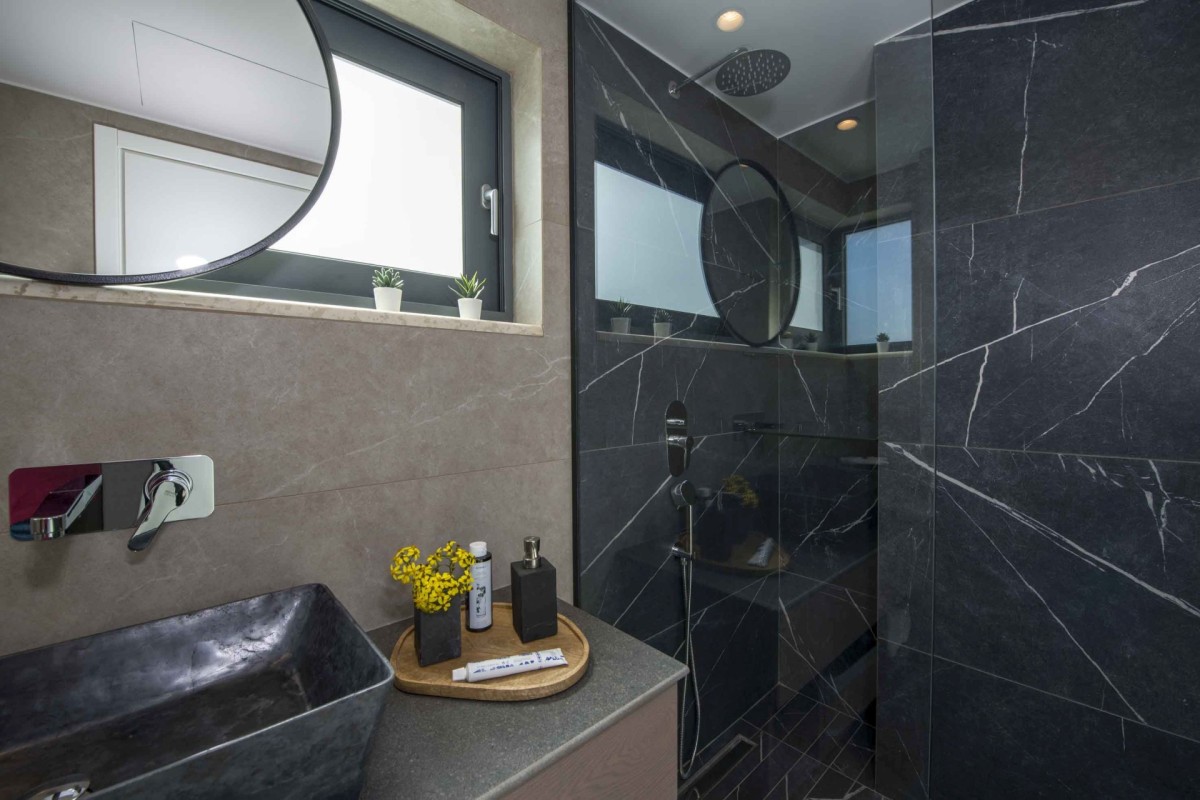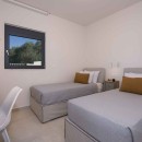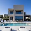 The villa features a neutral color palette and minimalistic design, offering a calming and sophisticated atmosphere. It consists of four spacious bedrooms, one of which is located on the ground floor and fitted with twin-size beds. This level also includes an open-plan living area with a cozy fireplace, seamlessly connected to a modern, fully equipped kitchen and a dining space where you can enjoy meals while admiring the sea view. The ground floor opens directly to the pool area and also includes a communal bathroom with a shower.