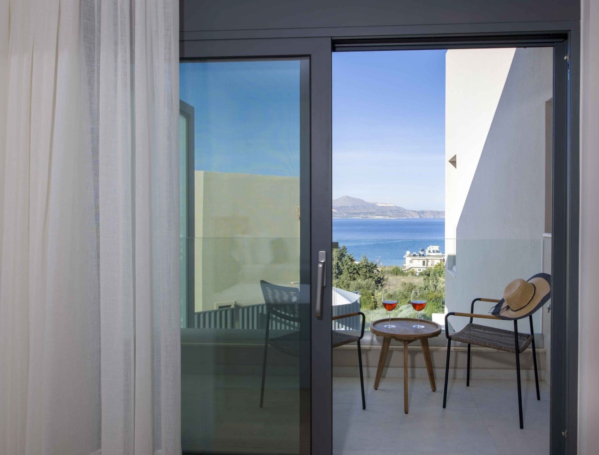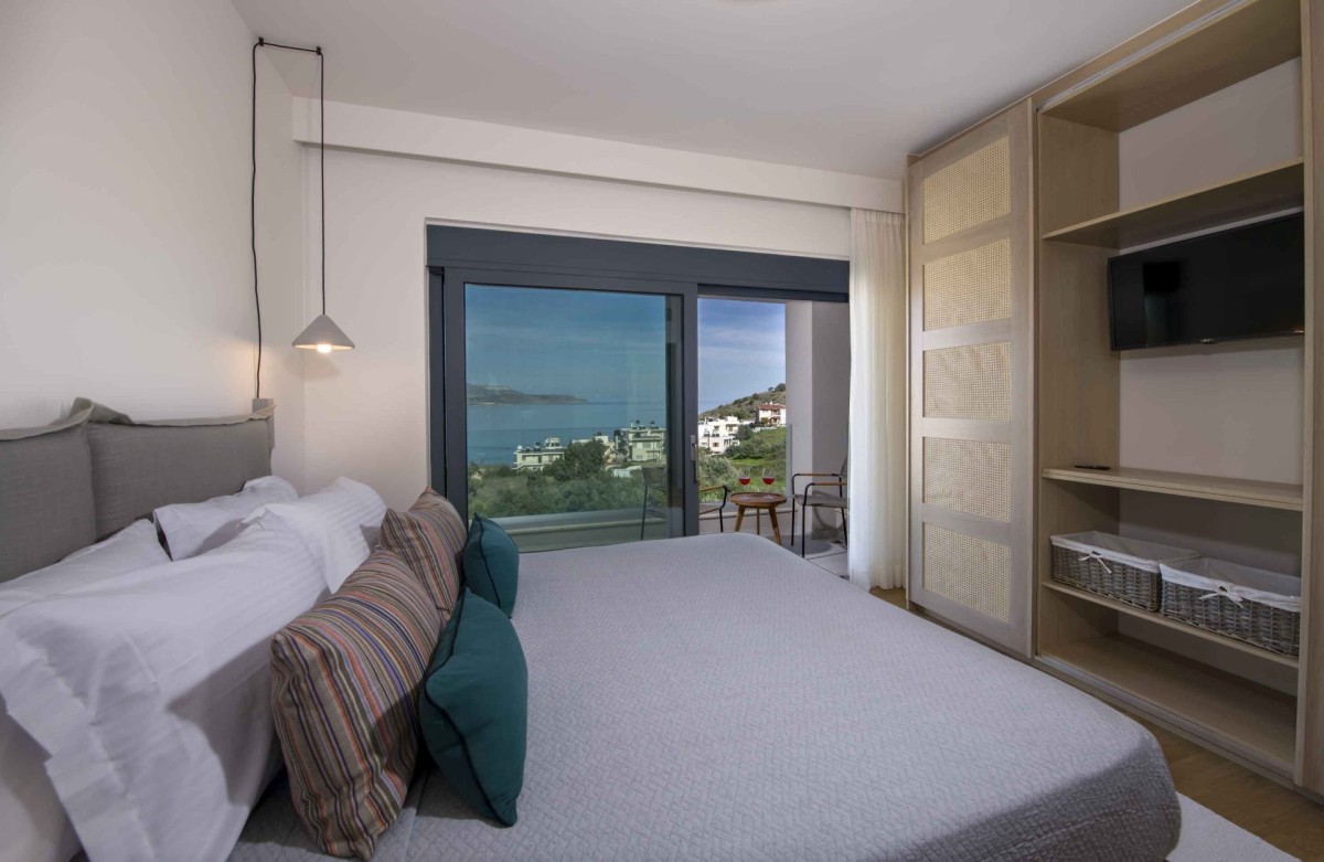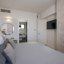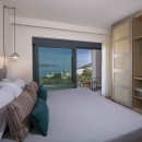 Bedroom 3: First floor bedroom with a king-size bed,  A/C, WiFi, TV, private balcony with panoramic view, and en-suite bathroom with shower, vanity, and WC. 2 guests maximum