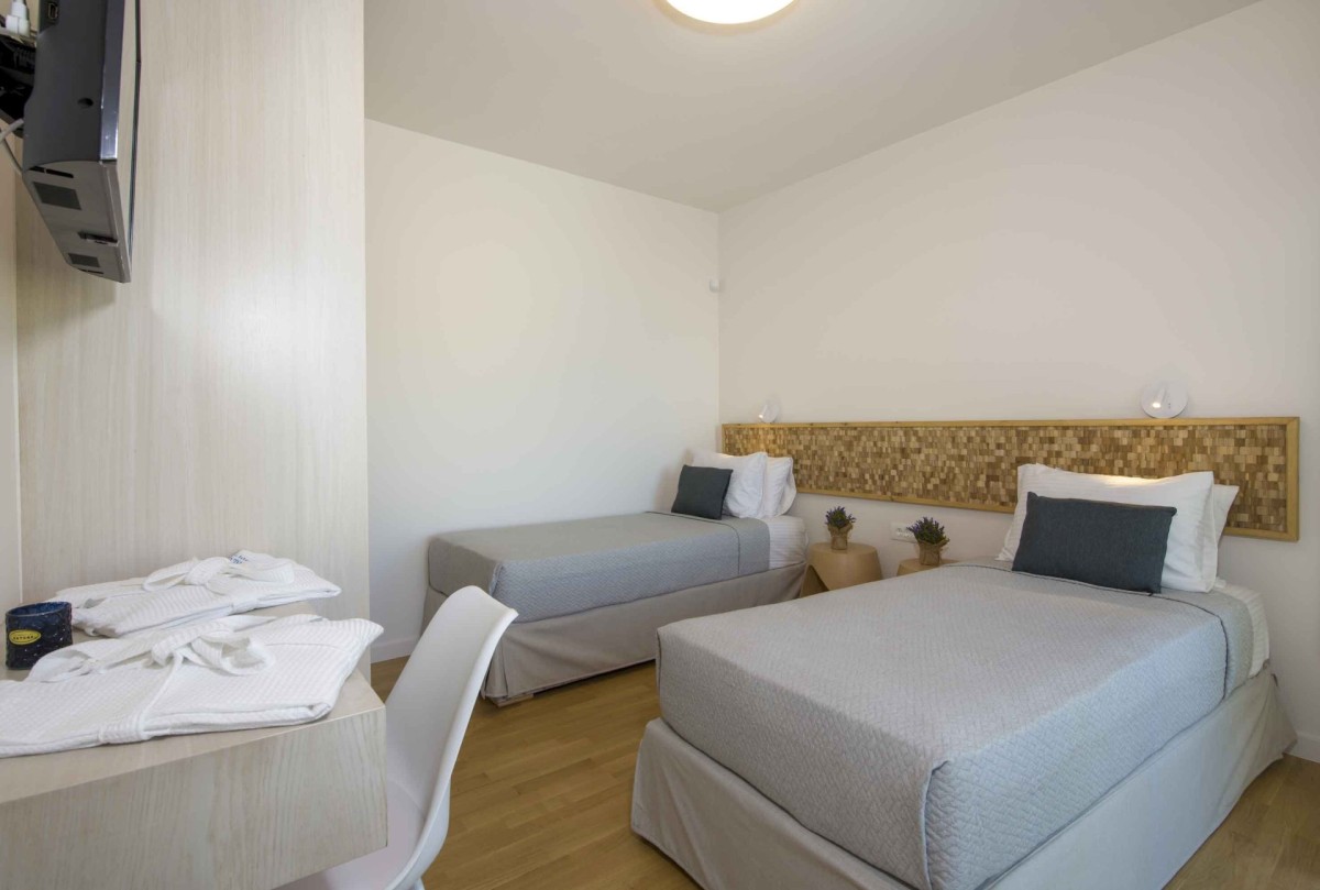 Bedroom 4: Top floor bedroom with two single beds,  A/C, WiFi, TV, private balcony with sea view, and en-suite bathroom with shower, vanity, and WC. 2 guests maximum