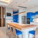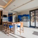 The terrace includes a fireplace and brick oven, several lounging areas and a dining space. Just inside the floor to ceiling glass doors is the great room. It uses a wonderfully clean and sleek esthetic that is never aloof or unwelcoming but instead encourages hours of leisure time spent reclining on the immense banquette sofas, savoring delicious meals at the dining room table or whipping up snacks or even complex recipes (with delicious local foods) in the modern, gourmet kitchen.