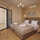 Bedroom 1: Ground floor bedroom with two single beds, A/C, WiFi, TV, kitchenette, and en-suite bathroom with shower, vanity and WC. 2 guests maximum