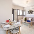 Upon entry, guests are greeted by a spacious open-plan living and dining area featuring a double sofa bed, a bathroom, a dining table, and a fully equipped kitchen with modern appliances such as a dishwasher, cooker, microwave, coffee machine, toaster, and kettle. French windows open onto a large covered balcony with an outdoor Jacuzzi and breathtaking views.
