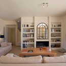 Ground Floor: Open-plan living and dining area with fireplace, large-screen TV, and fully equipped kitchen opening onto the terrace.