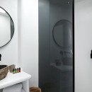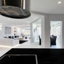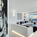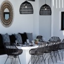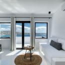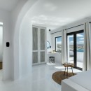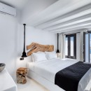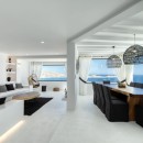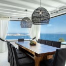 The villa’s common areas are dressed exclusively in black and white, designed to create an effortless flow between the interior and exterior. Huge windows overlook Psarou Beach, and French doors open to the pool terrace. The kitchen is fully equipped, leading to a spacious living room and dining area with the same impeccable sea view. The dining table comfortably seats 10 people. The five luxurious bedrooms are a dream, each with queen-size beds and en-suite bathrooms. Four of the bedrooms have private balconies for intimate moments in the sun or under the stars.