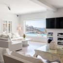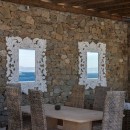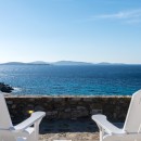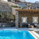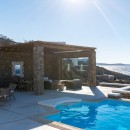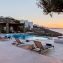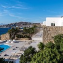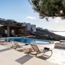 Welcome to Villa Deloxenia, situated in the Aleomandra area near Ornos Beach, is a modern luxury residence that features unique vintage elements. This spacious villa offers five en-suite bedrooms, accommodating up to 12 guests. Three double bedrooms are located in the main building, each providing breathtaking views of the Aegean Sea and Delos Island. Additionally, there are two guest houses with independent entrances: one with two double beds and the other with one.