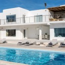 Natural light floods the villa through large windows, creating a warm and inviting atmosphere throughout the space. Outside, guests can relax by the private pool and enjoy the stunning sunsets that grace the property, particularly in the summer months when the sun sets directly in front of the villa. This picturesque setting offers a sense of peace and tranquility.