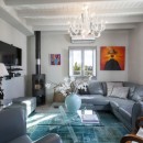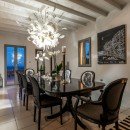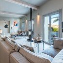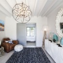 The villa's spacious terraces envelop the property, and upon entering, you are greeted by a cool blend of soft pearly grey decor, pastel leather sofas, and contemporary furnishings that harmonize with the tiled and polished cement floors and wooden furniture. The art adorning the walls showcases the talent of local artists, featuring block colors or black and white photographs. Designed to cater to groups of friends or large families, the villa offers easy internal access to all rooms, eliminating the need to step outside like many other villas.