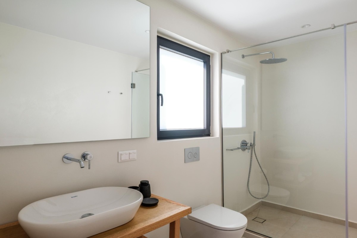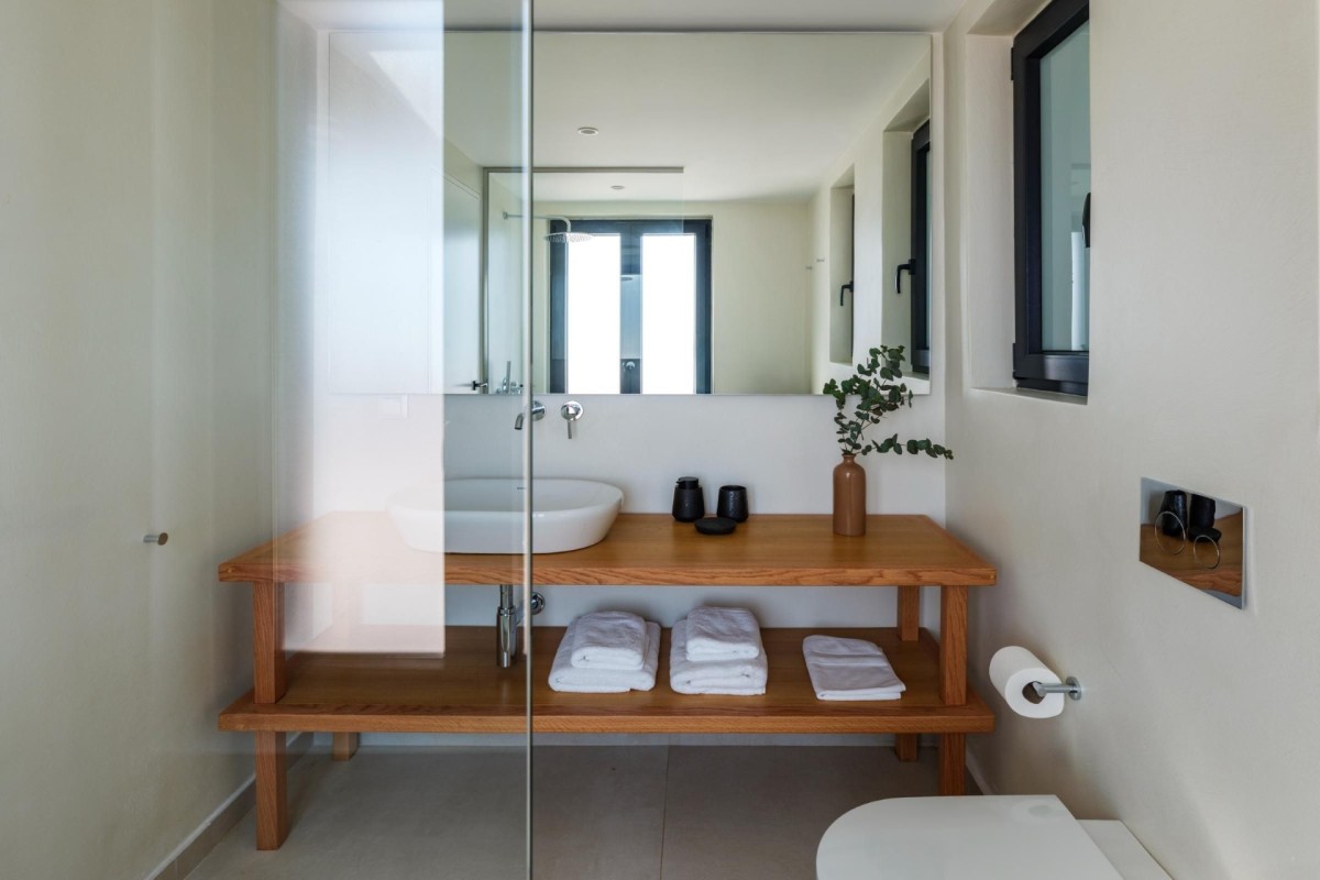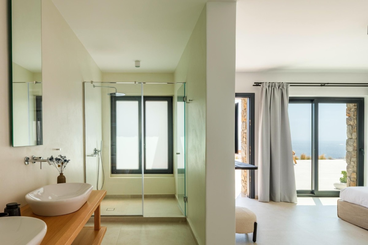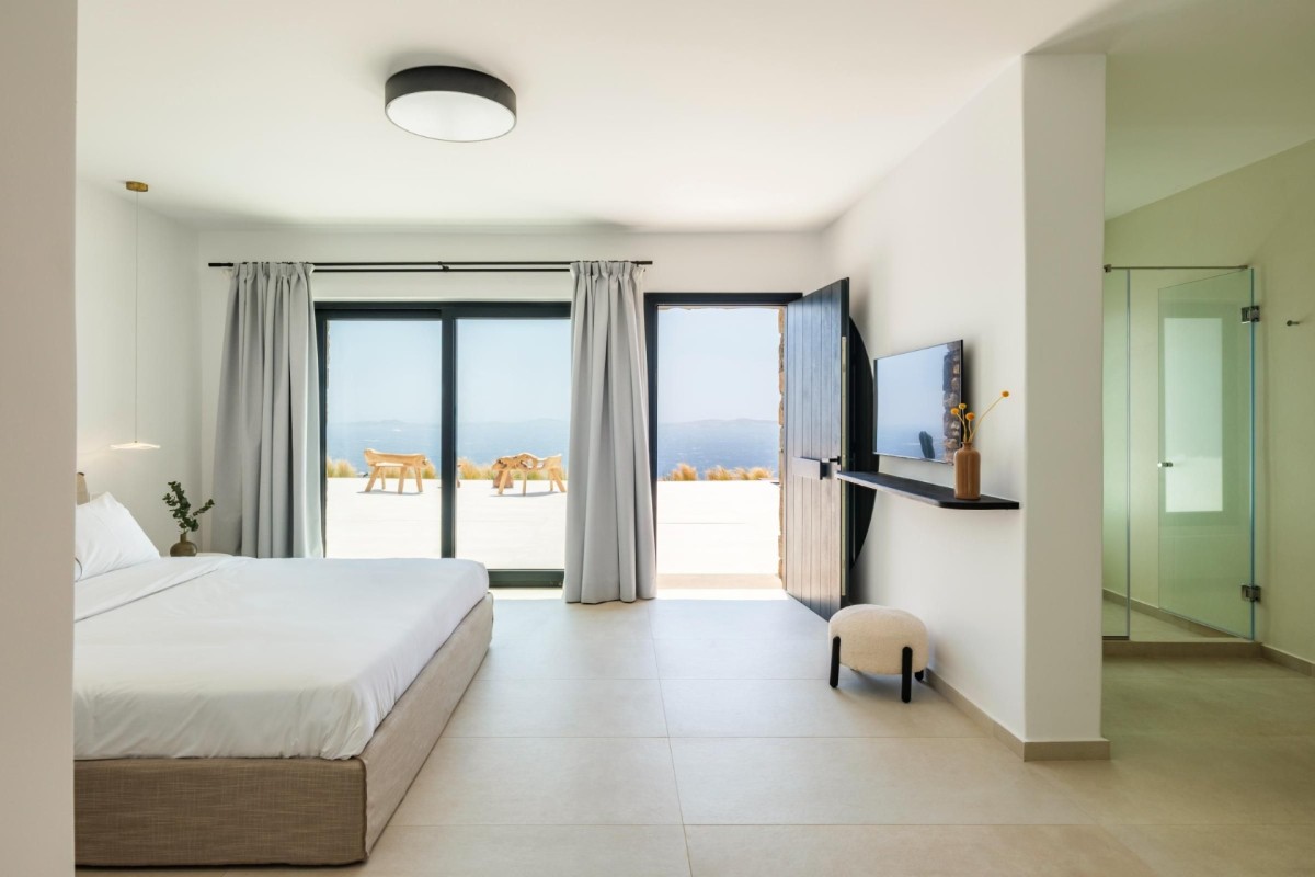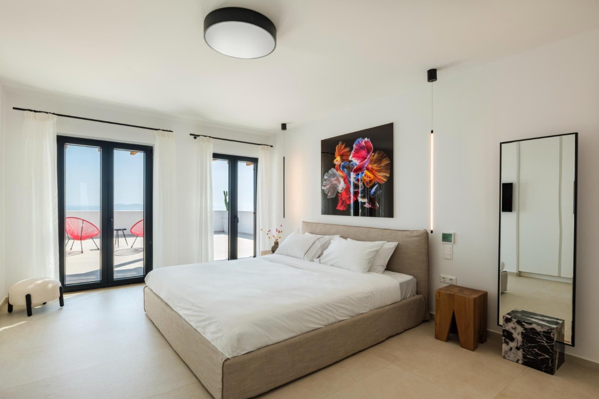 Casa Fly is a spacious, luxurious villa located in the prime area of Fanari, offering uninterrupted panoramic views of the Aegean Sea. Spread across two levels, the villa accommodates up to 10 guests in five double bedrooms, each with its own en suite bathroom.