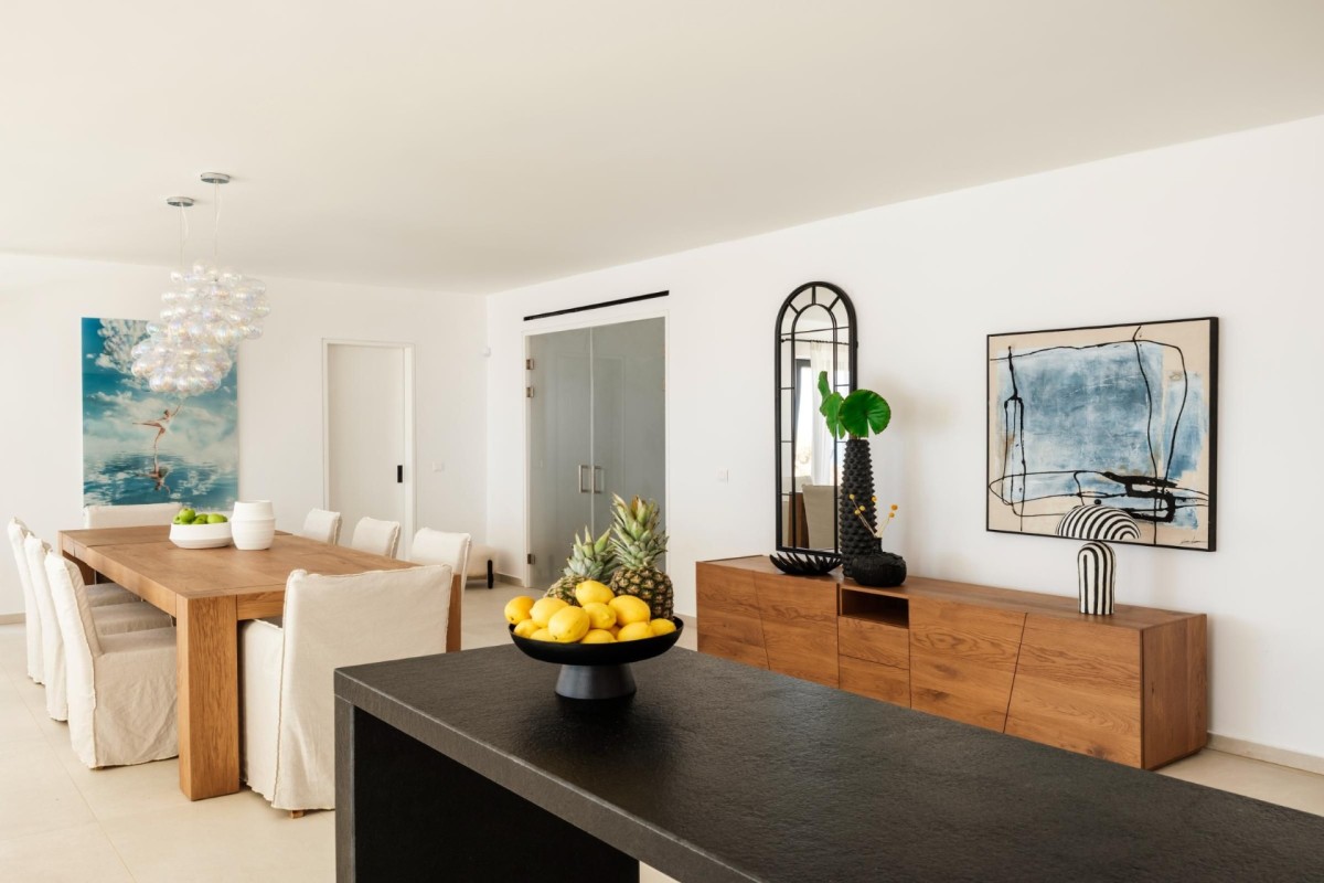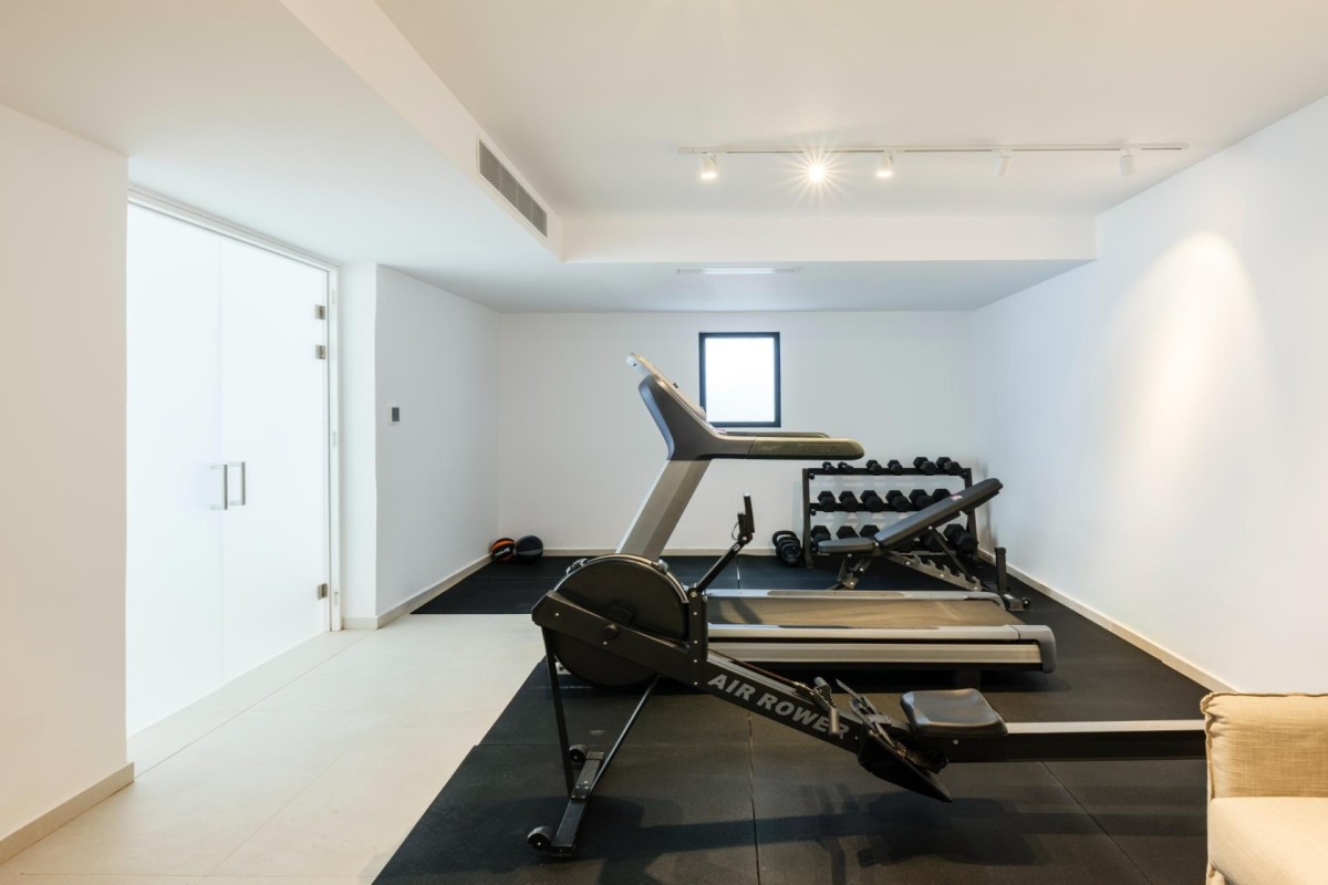 The upper level features two elegant double bedrooms with en-suites and private balcony access, where guests can enjoy stunning sea vistas. On the pool level, you’ll find a fully equipped kitchen, a gym area, and an open-plan lounge and living room. This level also hosts three independent guest bedrooms—each with an en suite bathroom and direct access to the inviting pool terrace.