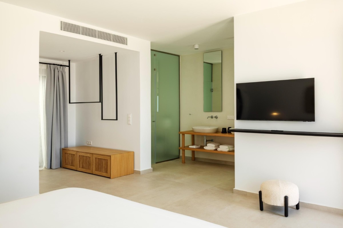 Bedroom 5: Pool level bedroom with a double bed, A/C, WiFi, TV, access to the pool, independent access, and en-suite bathroom with shower, vanity, and WC. 2 guests maximum