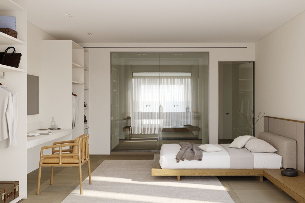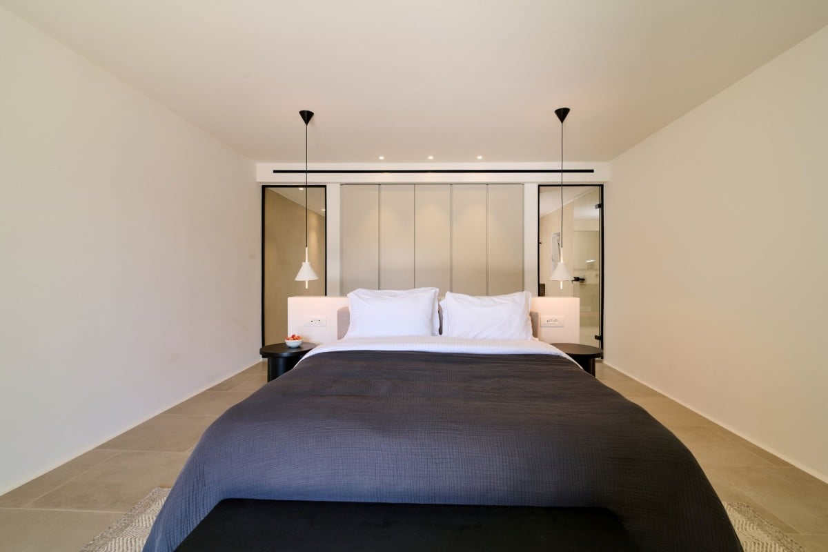 Bedroom 3: Entrance floor bedroom with a queen-size bed, A/C, TV, WiFi, safe, access to a terrace, sea view, and en-suite bathroom with shower, vanity, and WC. 2 guests maximum. Optional interconnection with Bedroom 4