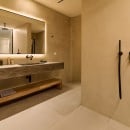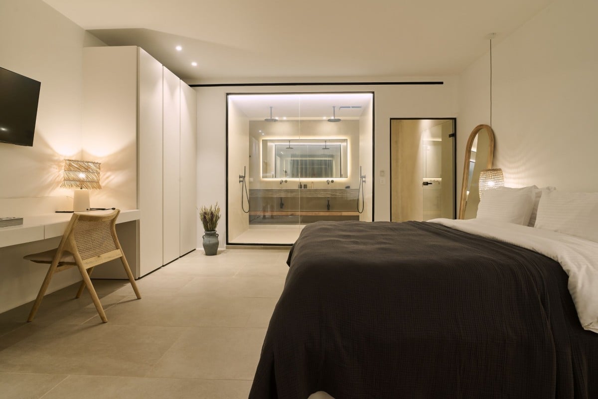 Bedroom 7: Lower floor bedroom with a queen-size bed, A/C, TV, WiFi, safe, lounge area, mini bar, access to the outdoor area, sea view, and en-suite bathroom with shower, double vanity, and WC. 2 guests maximum. Individual entrance.