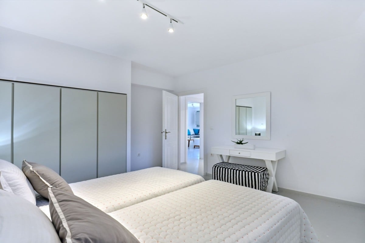 Bedroom 3: Pool level bedroom with a king-size bed (can be made as two single beds), A/C, WiFi, TV, and en-suite bathroom with shower, vanity, and WC. 2 guests maximum