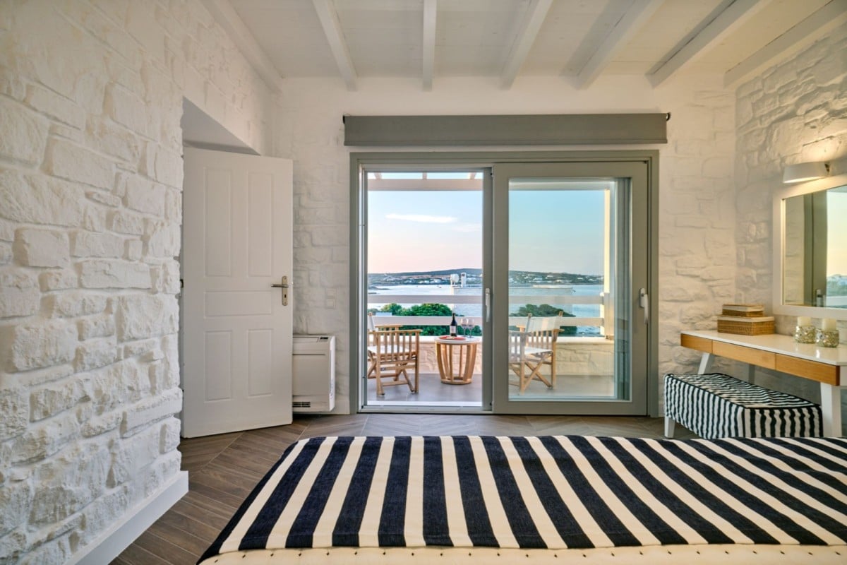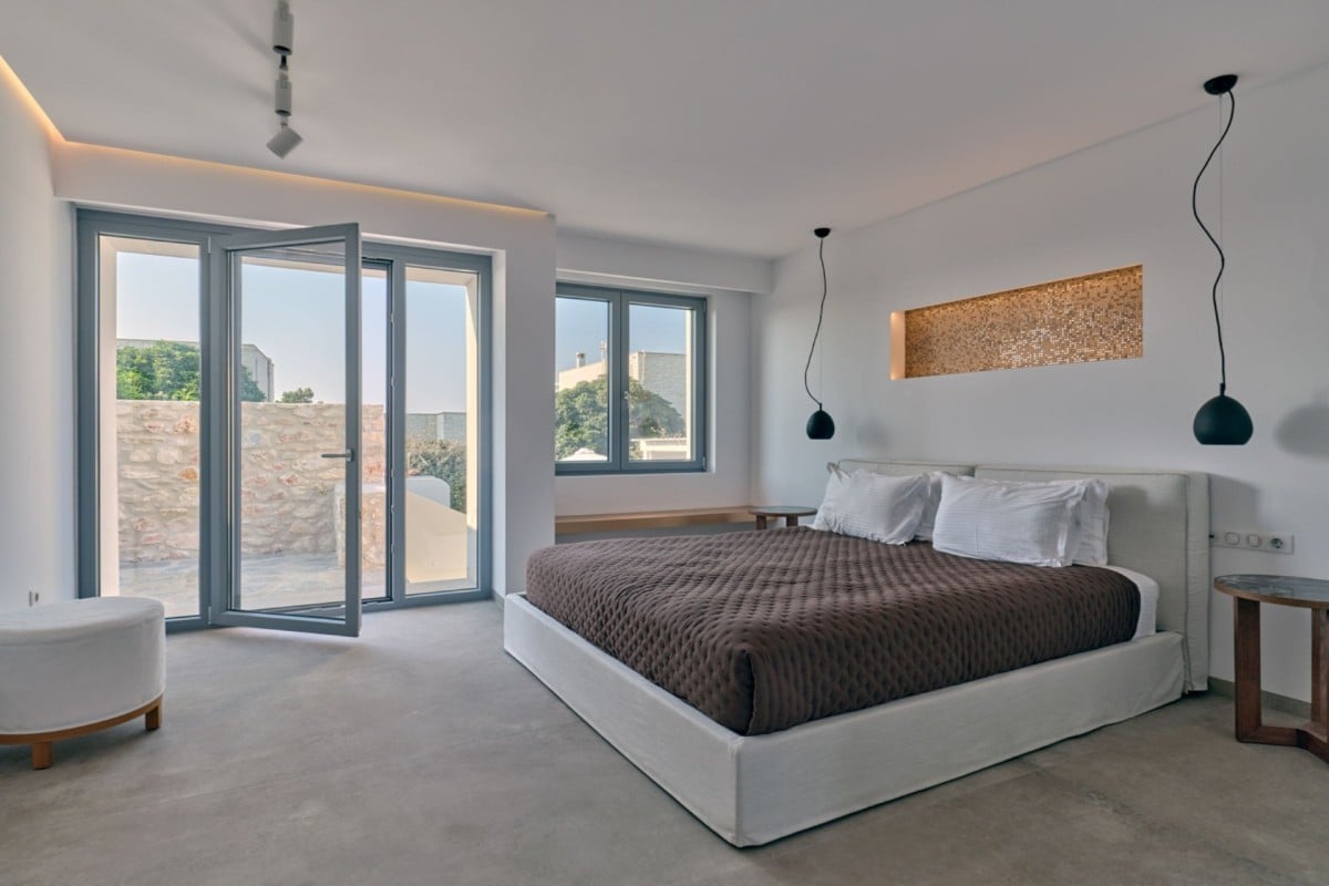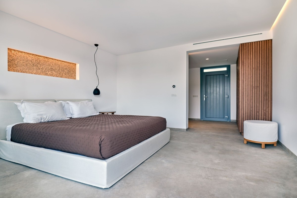 Blending comfort with understated luxury, Villa Agave features 4 bedrooms and 4 en-suite bathrooms, comfortably accommodating up to 8 guests. The property is arranged over three thoughtfully designed levels: the ground floor, the pool level, and the top floor. The ground level includes an open-plan living and dining area, a fully equipped kitchen, a staff room, and a spacious guest room offering added privacy. On the pool level, a cozy double bedroom with an en-suite bathroom is complemented by a generous living area complete with a charming fireplace. The top floor is dedicated to the Master Bedroom, featuring its own private living area, an en-suite bathroom, and a secluded balcony with stunning views of the bay and Naxos Island—an idyllic space for relaxation and enjoying the scenery.