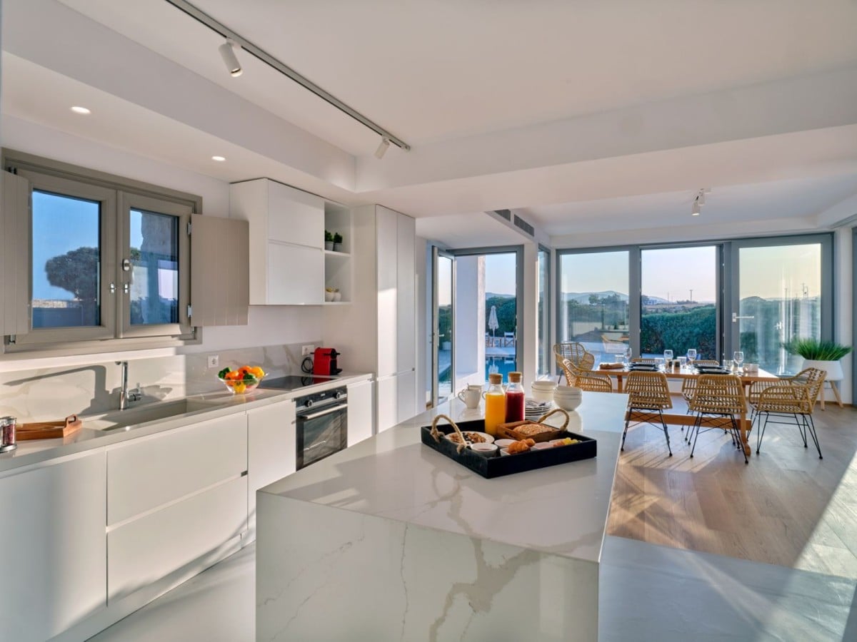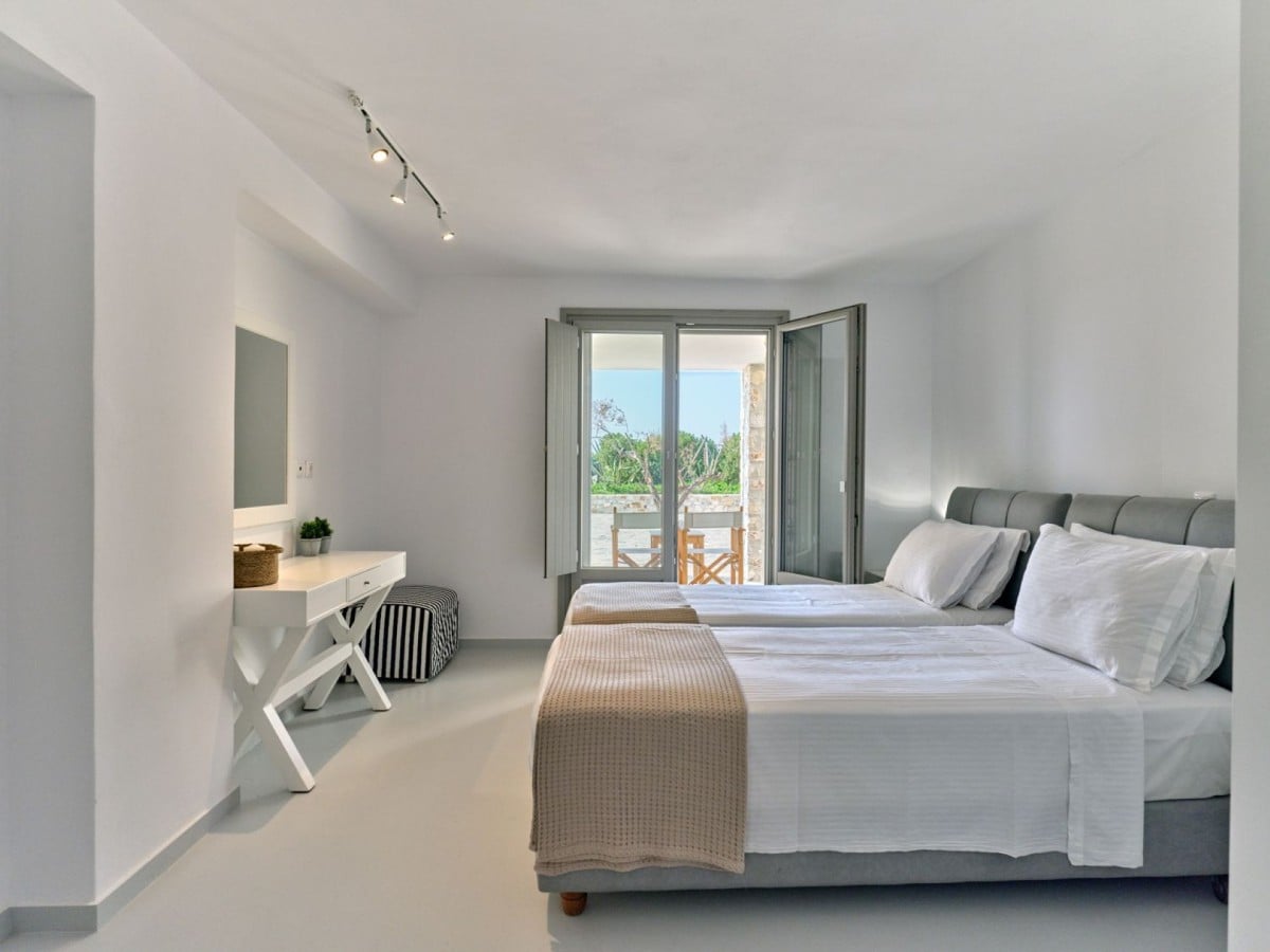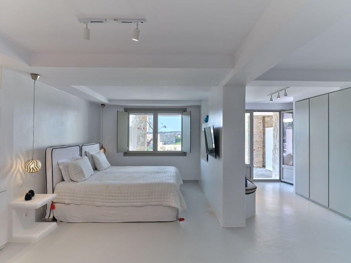 Outdoors, the property features a 120 m² private swimming pool surrounded by sunbeds and loungers—perfect for enjoying cocktails beneath the sunny skies of Paros. A shaded alfresco dining area by the pool, complete with a long marble table, wooden chairs, and a BBQ, sets the scene for unforgettable evenings and outdoor gatherings.