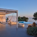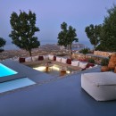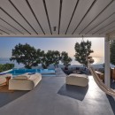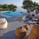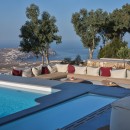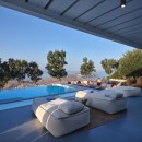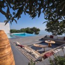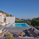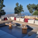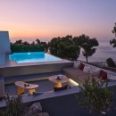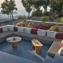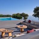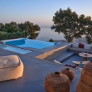 Step into the outdoors and ascend the mountain, where the monastery stands proudly above and the scenic town of Perissa stretches out below. As you reach the gated terraced private estate, Princess awaits you on the lower slopes, accessible via external steps. At the back of the villa, facing the sea, you'll find your own private terrace that truly impresses. The handcrafted infinity outdoor heated pool features a sunken lounge area, ensuring uninterrupted views from inside the villa. Relax in the hammock for a siesta, unwind on the beanbag loungers, or enjoy an al fresco meal under the sunshade at the wooden table and dining chairs, all while admiring the mesmerizing view of the sea, sky, clouds, and, on clear days, the outline of Crete on the horizon.