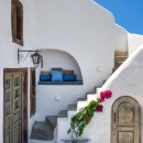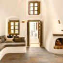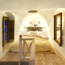 Ascending to the second level reveals refined accommodation echoing Santorini's heritage while providing sophisticated comfort.