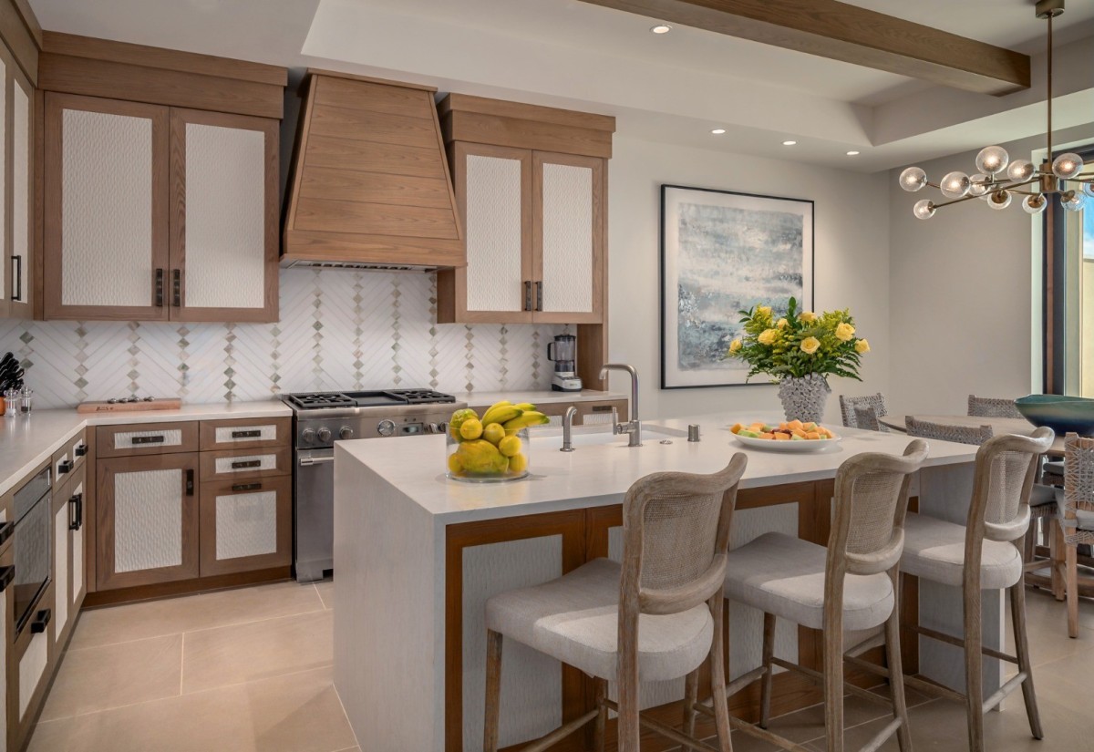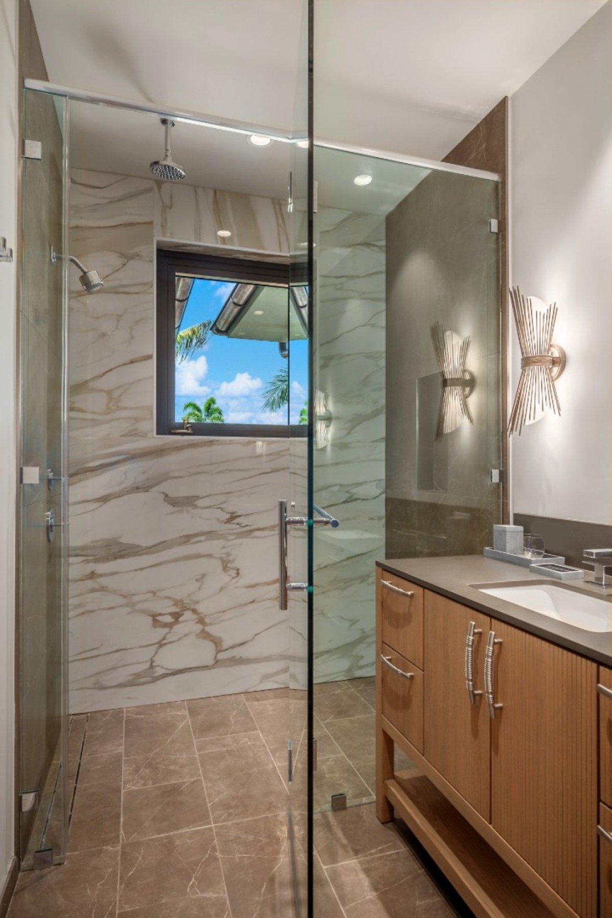 The primary suites offer a true escape, with private lanais and, in select homes, outdoor rain showers that bring the tropical experience full circle. High ceilings and disappearing glass walls throughout the home create a sense of openness, while finishes like porcelain tile flooring, natural stone vanities, and integrated wine coolers elevate the experience.