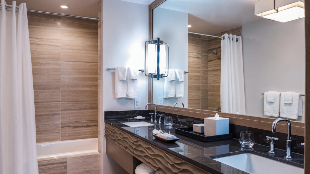 Inside, the design blends a modern aesthetic with timeless island charm. Greyed woods, textured white oak flooring, and millwork are paired with elegant touches like silvered iridescent stone tile and shell-inspired glass accents. The result is a tranquil, coastal-inspired retreat that invites you to unwind in style.