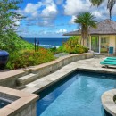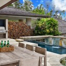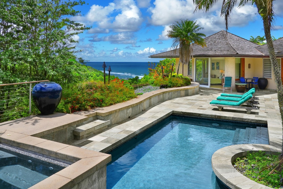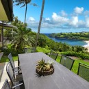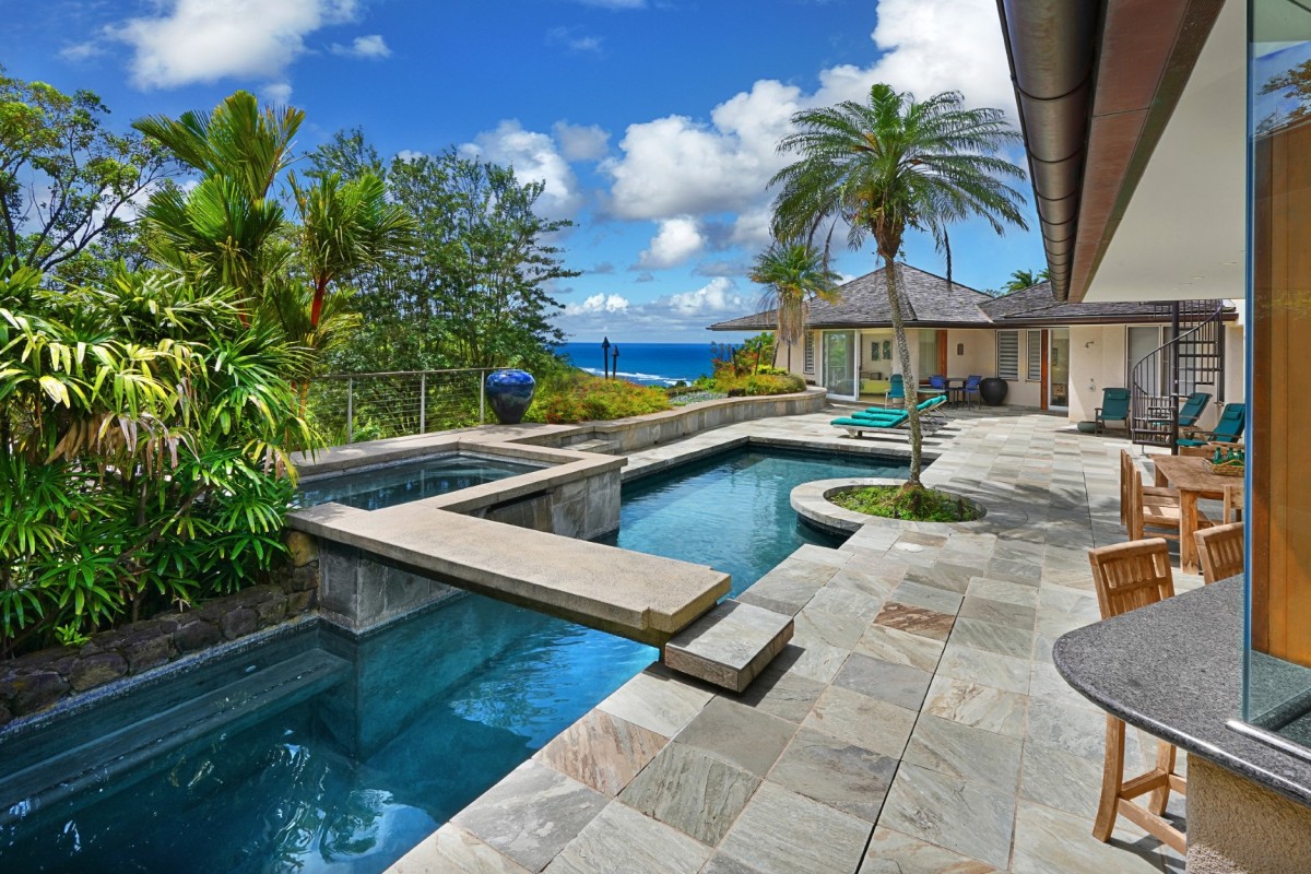 Welcome to Hale O’Keanuenue, a stunning private estate perched on a bluff between Anini Beach and Kalihiwai Bay on Kauai’s breathtaking North Shore. This luxurious Balinese-inspired retreat offers sweeping views of the ocean, lush mountains, and a serene river valley, all visible through expansive floor-to-ceiling glass windows that seamlessly blend indoor and outdoor living.