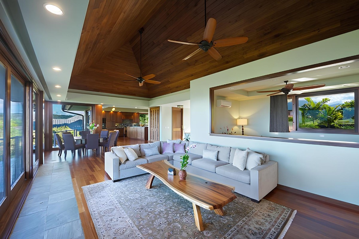 Inside, the home features a spacious open-concept living area that invites the outdoors in. Oversized sliding glass doors lead to expansive lanais and offer stunning views of the coastline and surrounding greenery. The fully equipped kitchen opens into the main living space, making it perfect for entertaining or enjoying laid-back family meals. Each bedroom is designed with comfort in mind, offering air conditioning, quality linens, and large windows that frame the lush Kauai landscape. A bonus pullout bed adds extra sleeping space without compromising comfort or style.