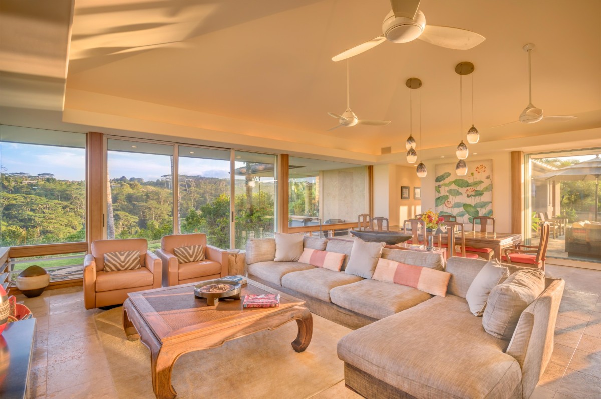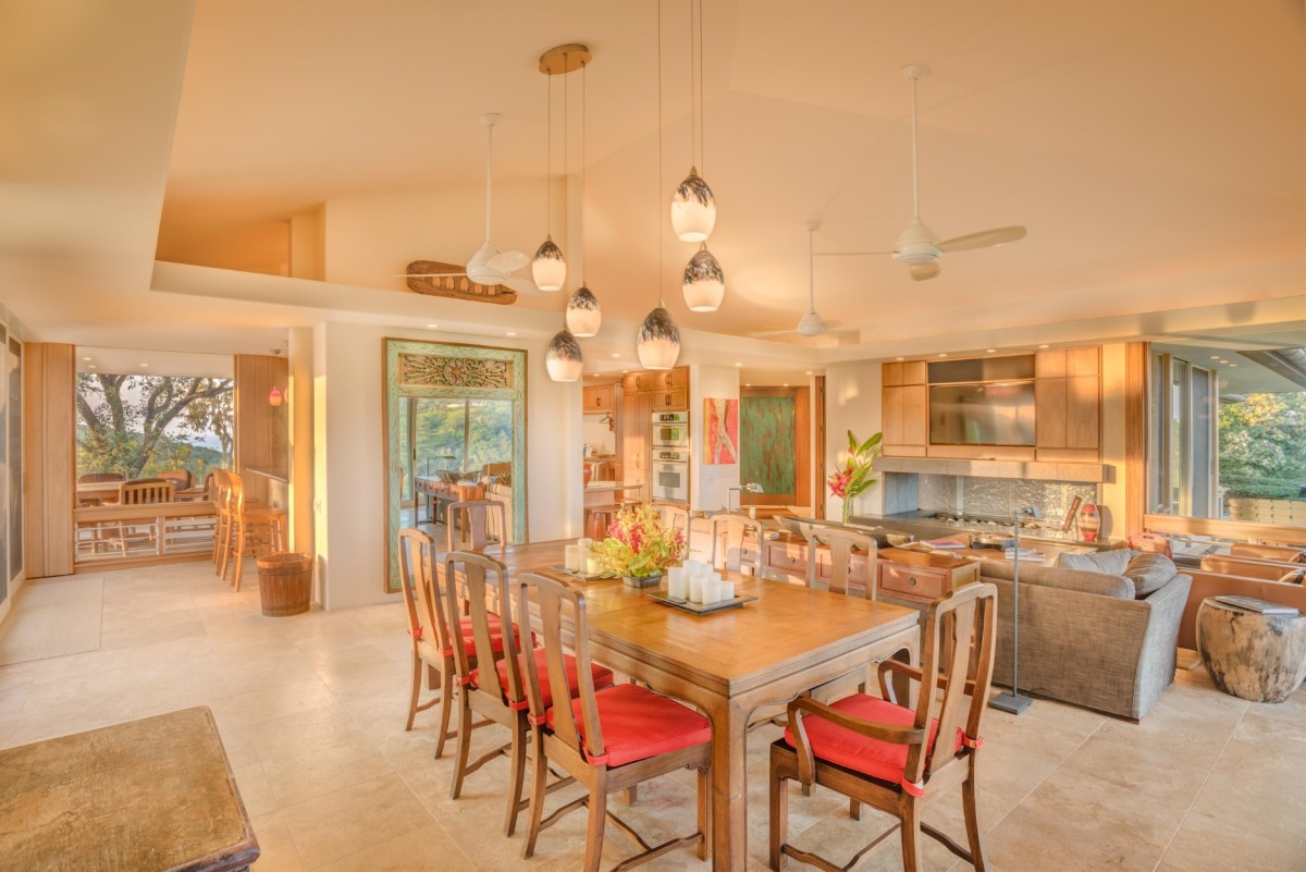 Escape to paradise at Kalihiwai Bluff Hale, a stunning 3-bedroom, 3-bathroom estate perched on a scenic bluff between Anini Beach and Kalihiwai Bay on Kauai’s breathtaking North Shore. This Balinese-inspired retreat is designed to fully immerse you in the beauty of Hawaii, with floor-to-ceiling glass windows that showcase panoramic views of the ocean, mountains, and lush river valley.