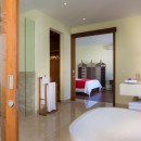Bedroom 1: Master bedroom with a king-size bed, seating area, TV,  A/C, walk-in wardrobe, access to pool,  and en-suite bathroom with shower, bathtub, double vanity, and WC. 2 guests maximum