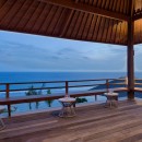The exquisite villa is located at the top of a cliff overlooking the Bukit peninsula. The peninsula is on the southernmost tip of Bali and features white sand beaches and beautiful coves.