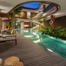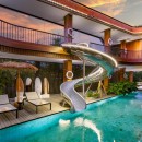 At the heart of the home, a dramatic silver spiral slide twists from the upper floor into the swimming pool, creating a playful centerpiece in the soaring central atrium. Across its three expansive levels, the residence flows effortlessly between indoor and outdoor spaces, offering generous areas to relax, gather, or retreat in privacy.