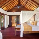 Both the living and dining areas have a luxurious flagstone floor, and the outdoor lawn lends itself to traditional Balinese dancing. The pavilion has antique-style daybeds, an ornate coffee table, and comfortable seating and dining space for up to eight people. Ceiling fans abound to ensure comfort in the balmy island air. Don’t miss any of the antique artifacts or ornaments that are thoughtfully spaced throughout the home.