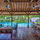 This holiday home has a main house and a separate guest pavilion, both built in the traditional Balinese design. You’ll notice high bamboo ceilings and antique furniture, as well as thoughtfully chosen decorations, art, and textiles.